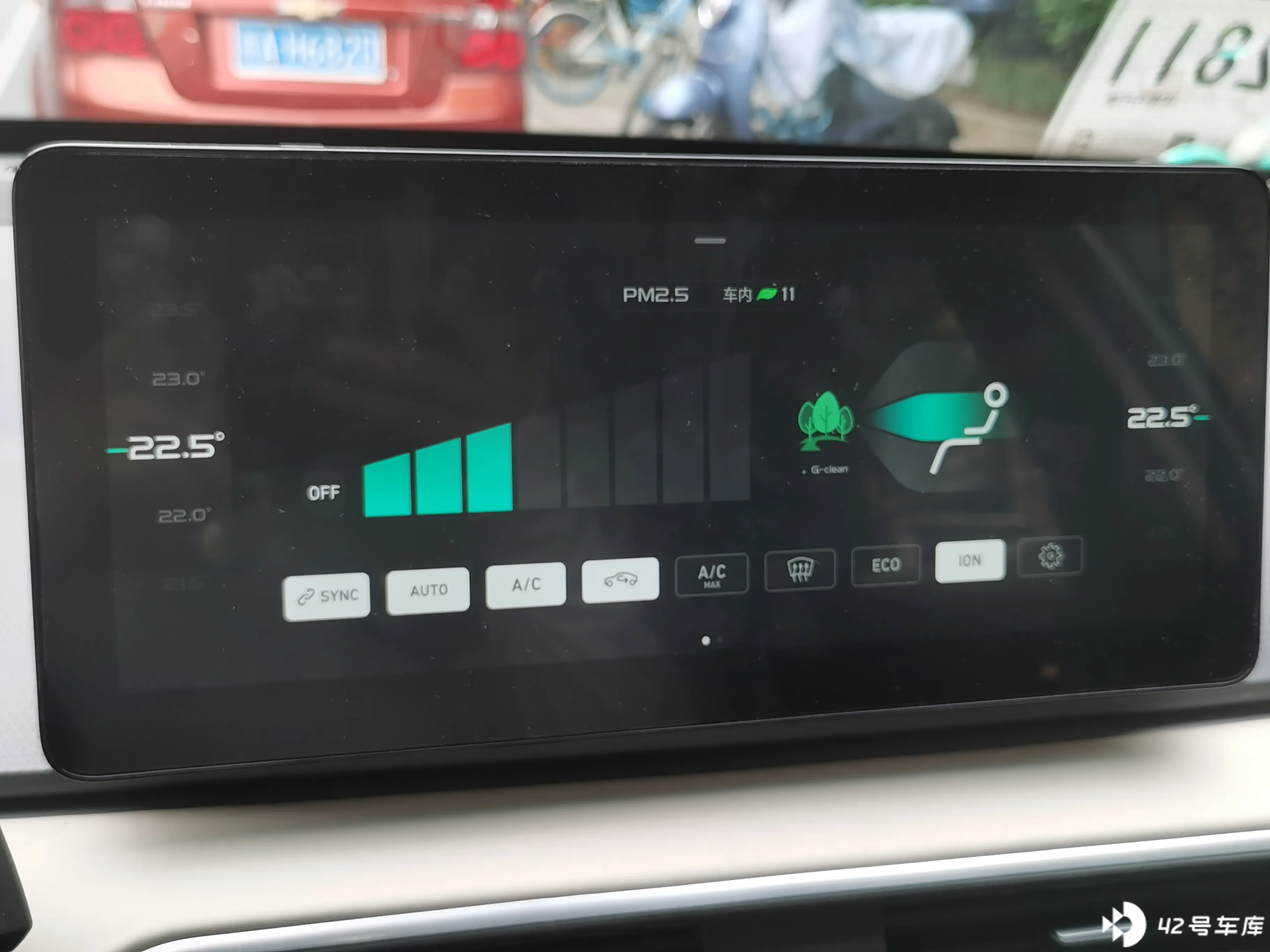 车内空调调节。据说该车配备了车规级 CN95 防护、PM2.5 过滤空气、ION 空气净化,如果真的这么强大的话对于有干净强迫症的人是个很好的吸引点。