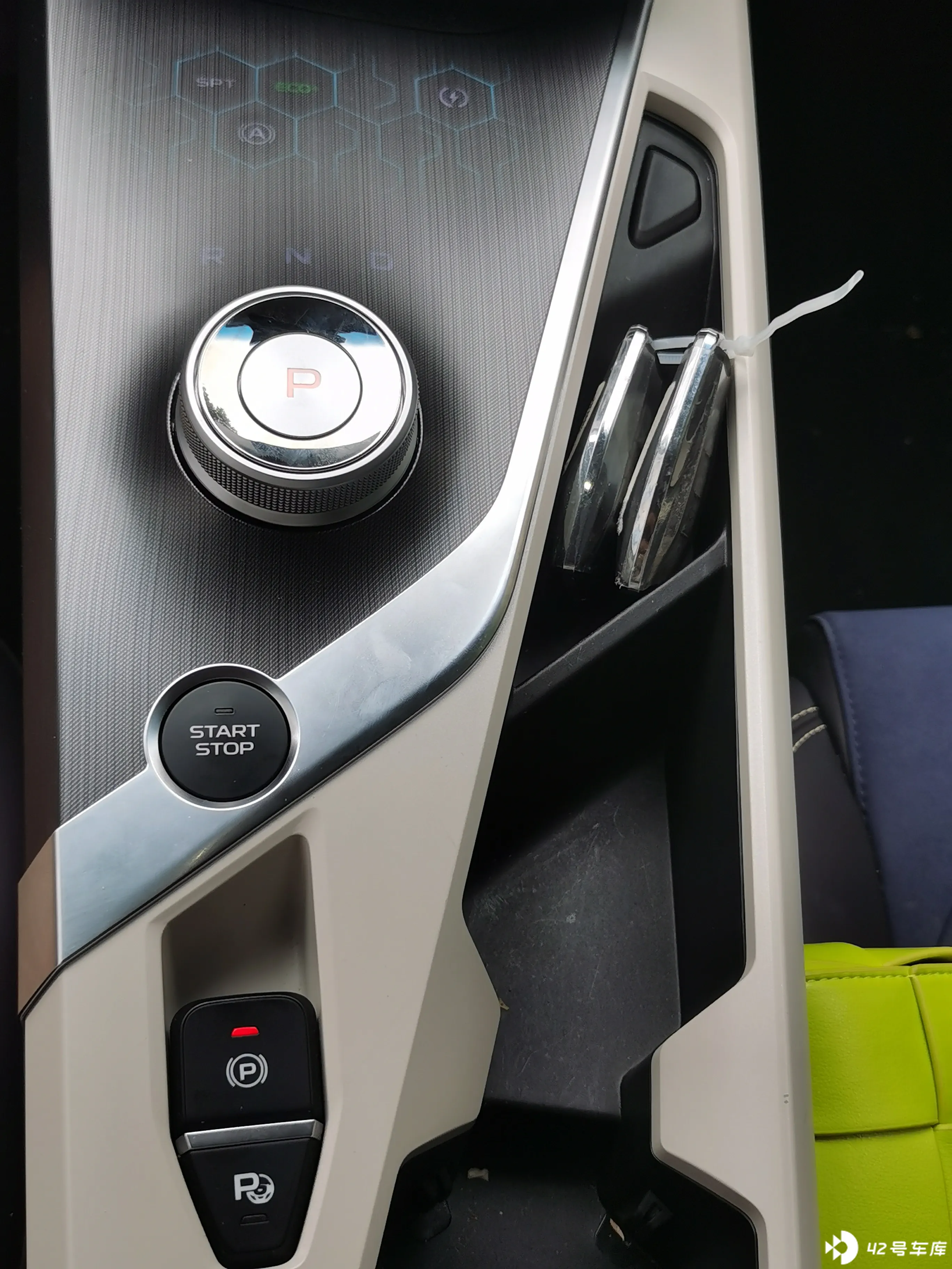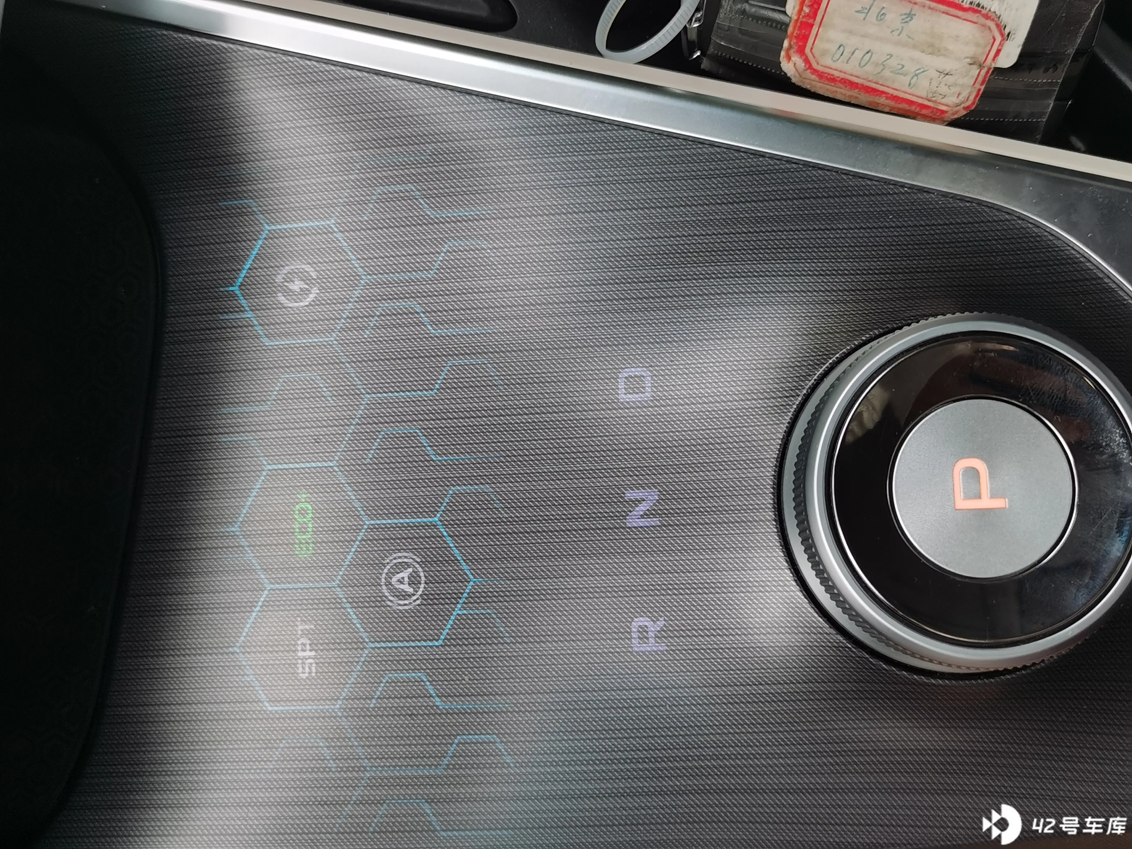 这个蜂巢区域可以双击控制切换到 S 档运动模式、ECO + 节能模式、能量回收模式等。档位是用旋钮旋转切换 R、N、D 档的。