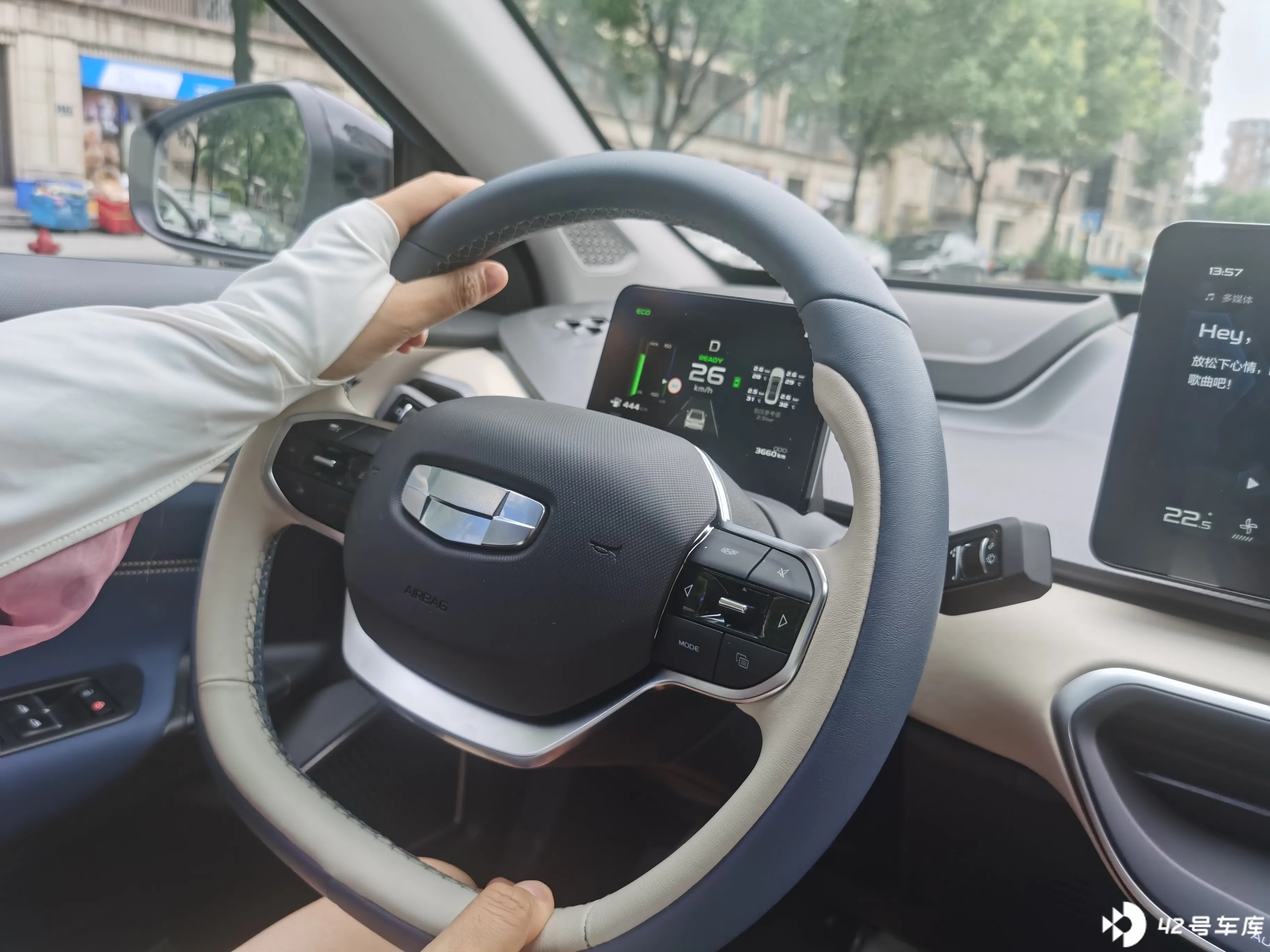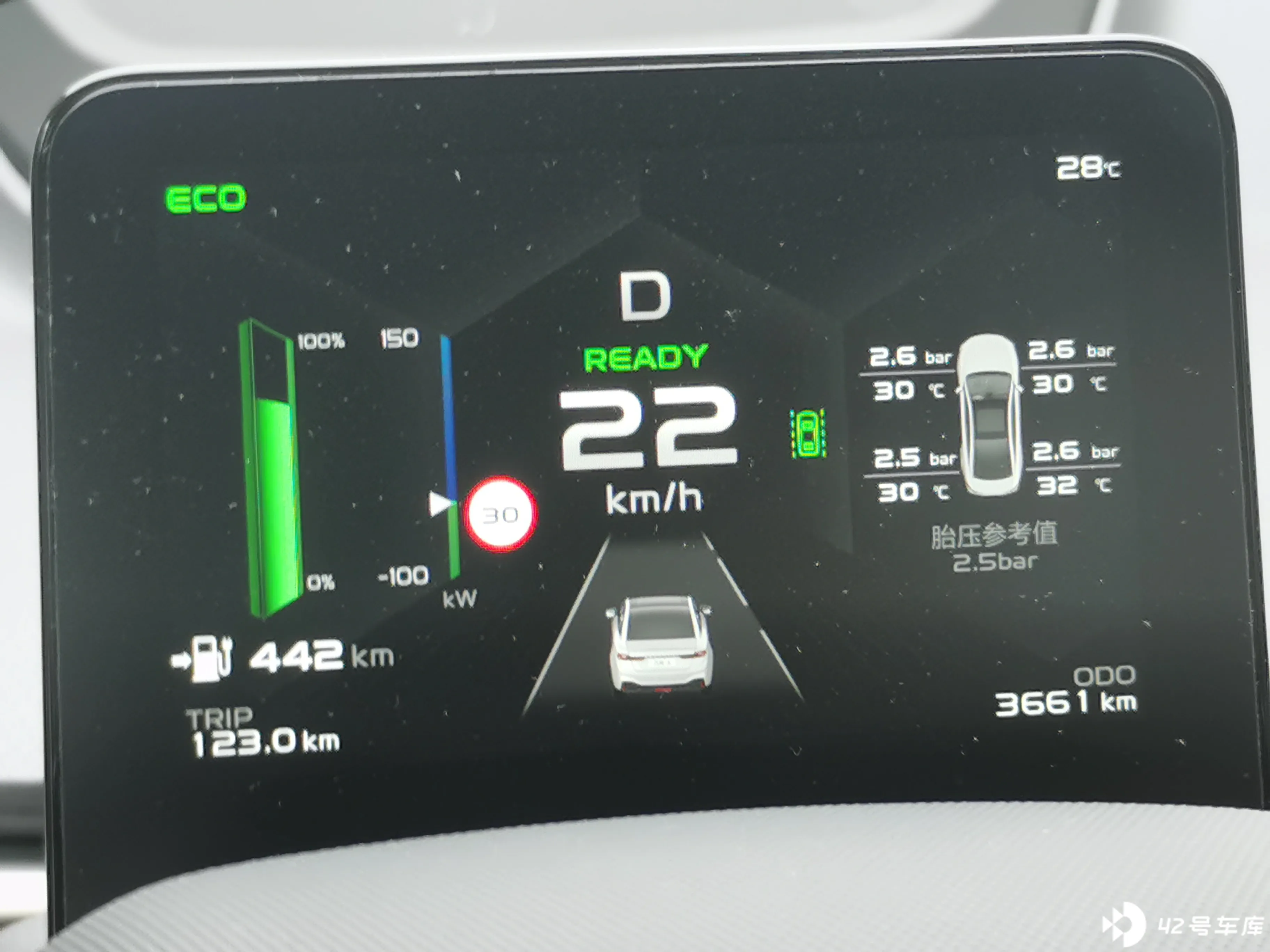 仪表屏就在方向盘正中上方,大小略小,比手机大比 Pad 小。显示的信息量还不少。