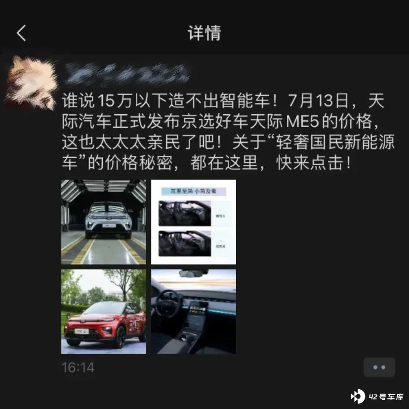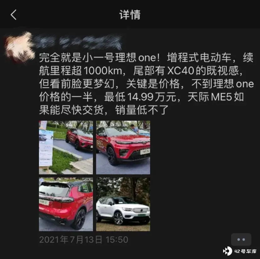 前两天,恰逢天际的第二款车型、也是天际首款增程式电动车天际 ME5 正式上市,于是我的朋友圈就变成了这个样子: