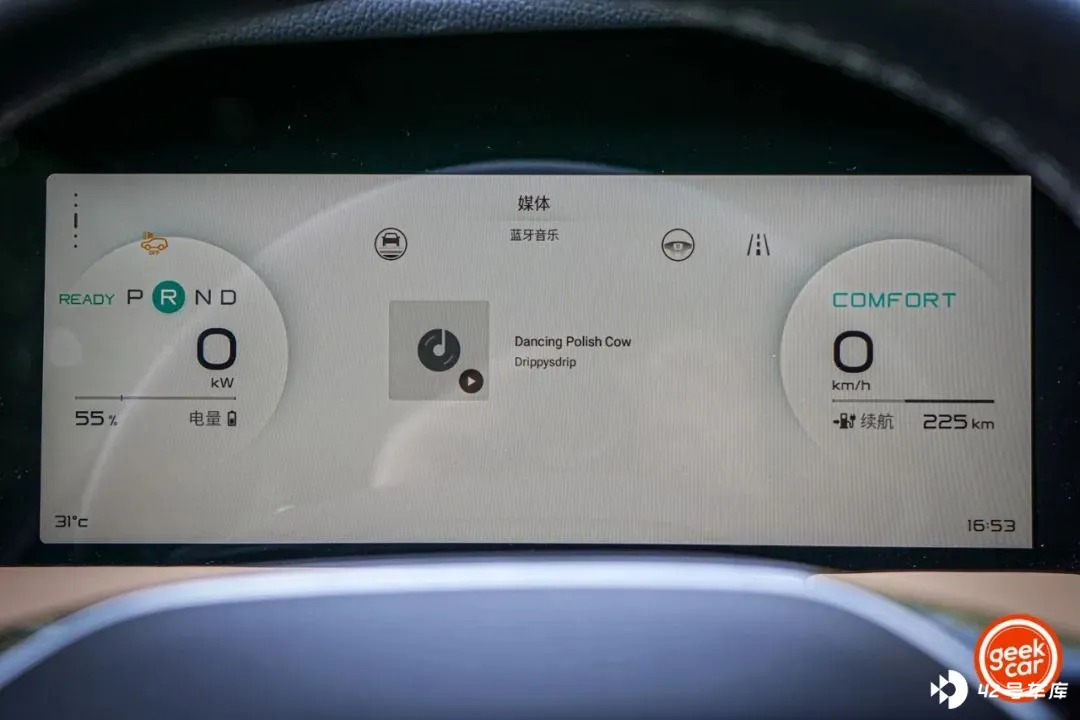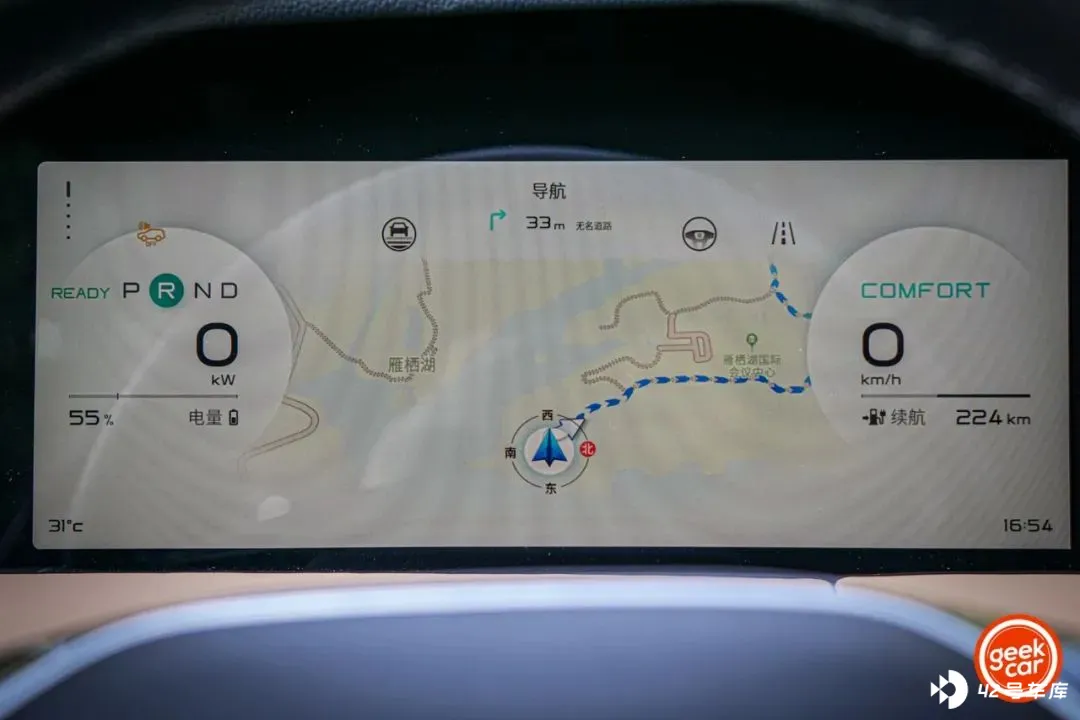 仪表除了可以显示时速、电耗、档位、时间和温度等基础信息以外,仪表正中的部分还可以切换包括导航、辅助驾驶、媒体、里程信息等功能。