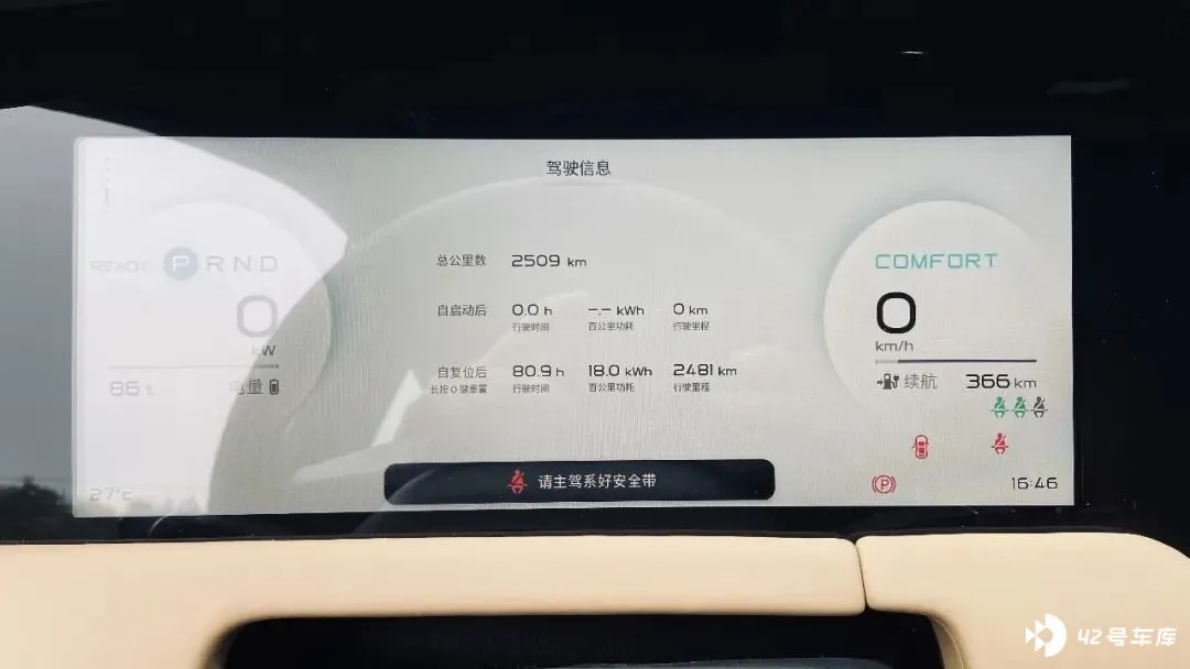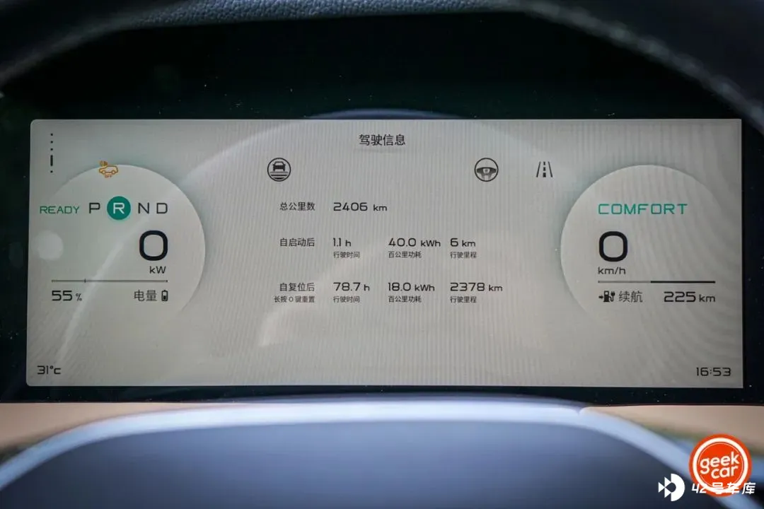 在今年 5 月底,我取到车的时候,这台天际 ME7 还是刚上完牌、总行驶里程仅 28 公里的新车。在 6 月底还车的时候,总行驶里程已经变为了 2,509 公里。取车的时候忘记拍公里数了,但我当时复位了一下小计里程,大家从下面这张图里可以算出来。
