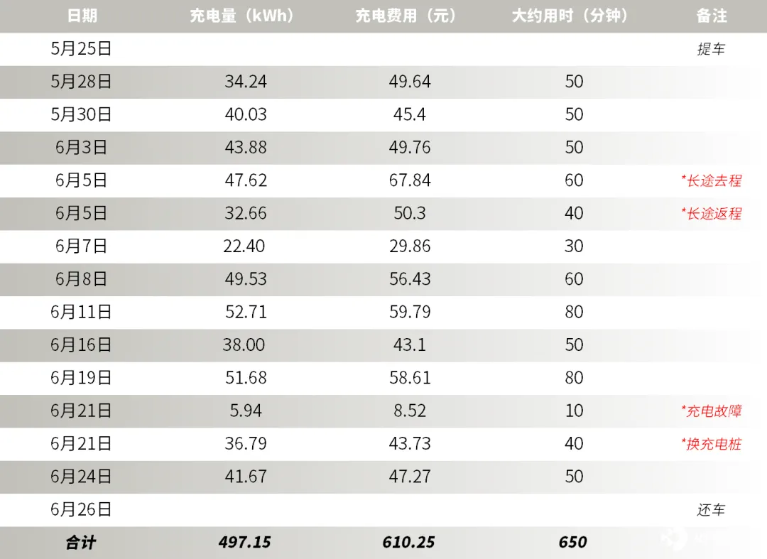 一个月里,共充电电量约 500 kWh、充电费用约 610 元(不包含停车费)、充电用时约 11 小时。