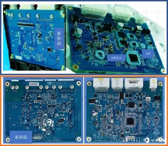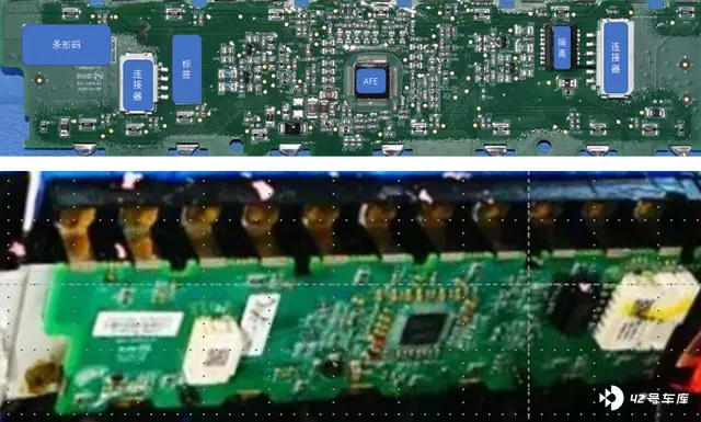 下面有一张图,CMU 通过激光焊接的方式固定在了电芯的输出极上面,也达到了把 CMU 支撑起来的效果。整块板主要包含 AFE 和菊花链的芯片。在这里最重要的是,比亚迪把均衡电路给干掉了,没有放电电阻、没有控制放电电阻的三极管。只保留输入的滤波电路和通信电路。这个 CMU 的设计,有几点特殊的地方: