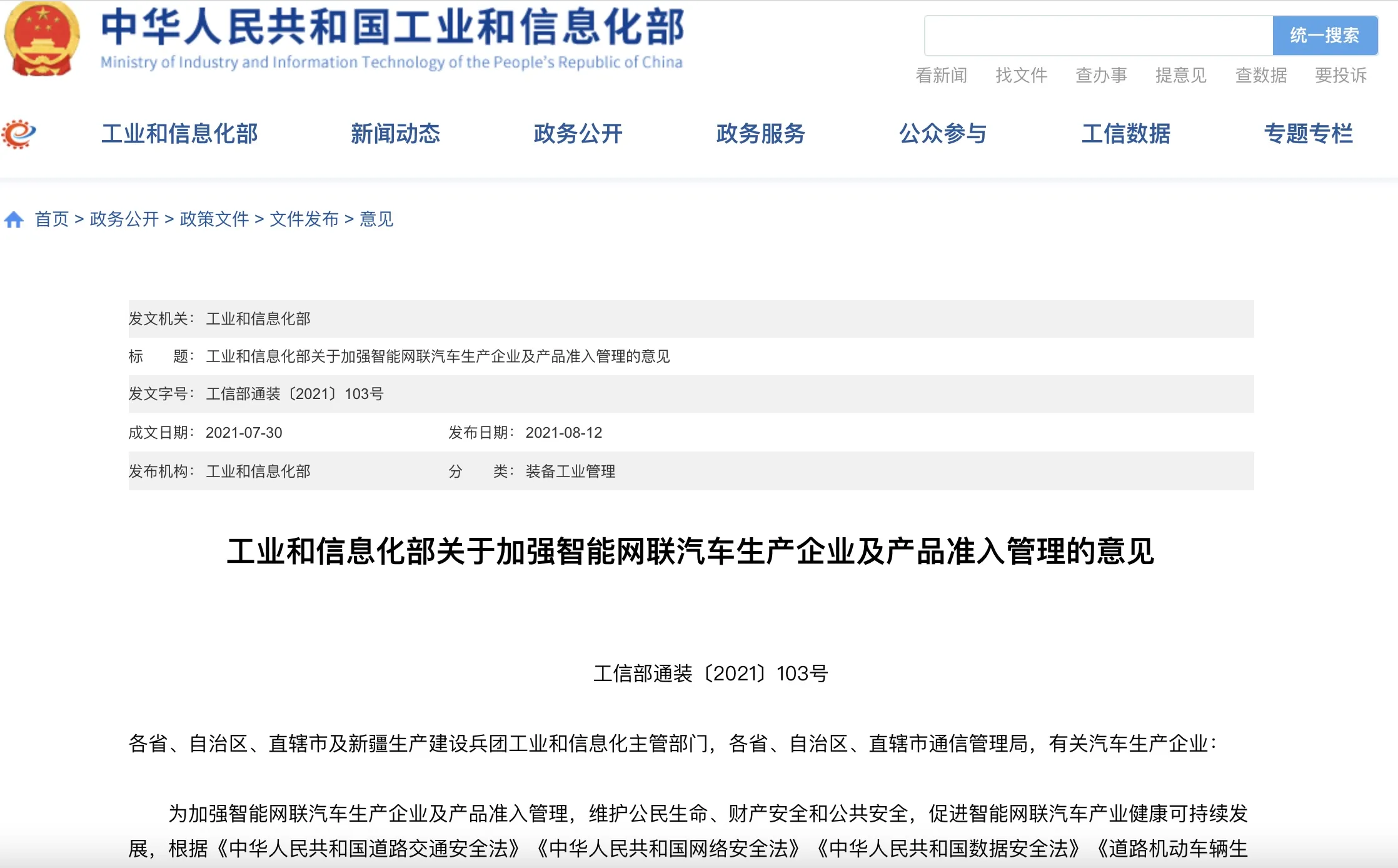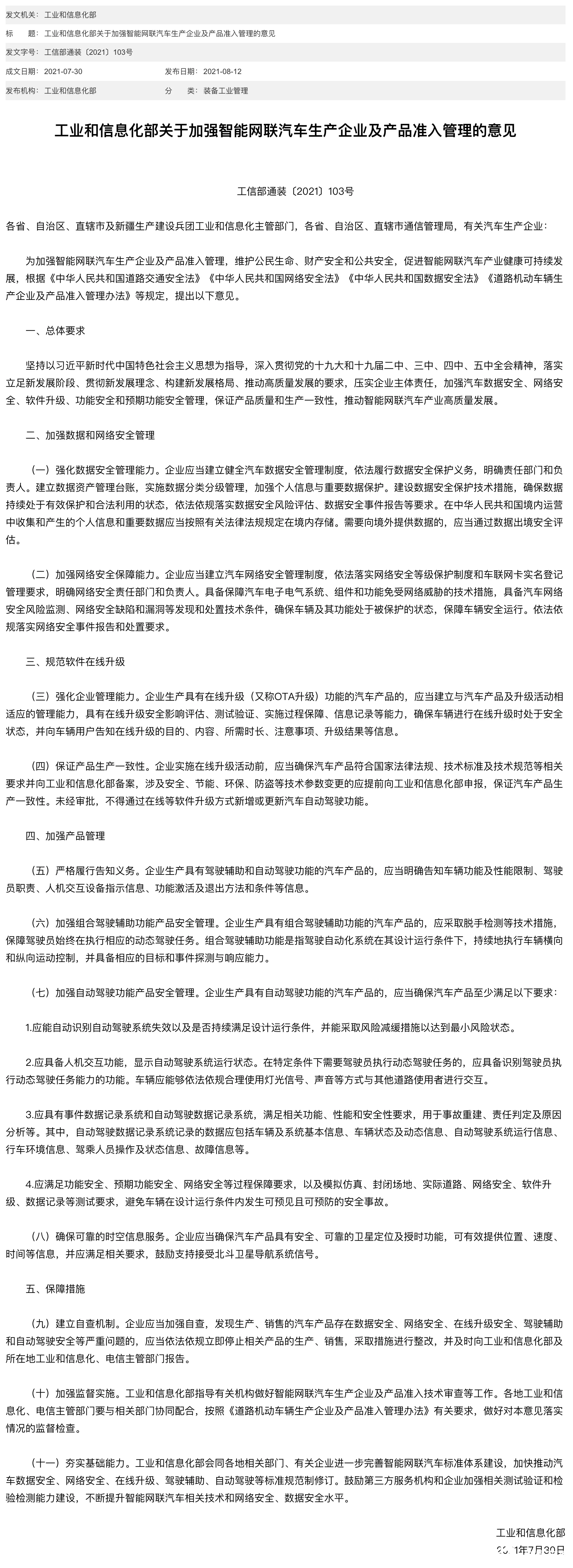 2021 年 8 月 12 日,工信部发布《工业和信息化部关于加强智能网联汽车生产企业及产品准入管理的意见》,以下是从该《意见》中节选的几个要点。