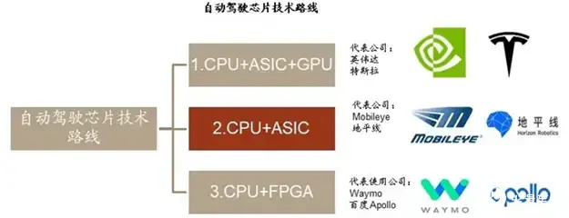 CPU+ASIC:如 Mobieye EyeQ5=CPU+ASIC(CVP 传统视觉 + DLA 深度学习 + MA 多线程加速),地平线征程 2=CPU+ASIC(BPU-AI 任务处理);