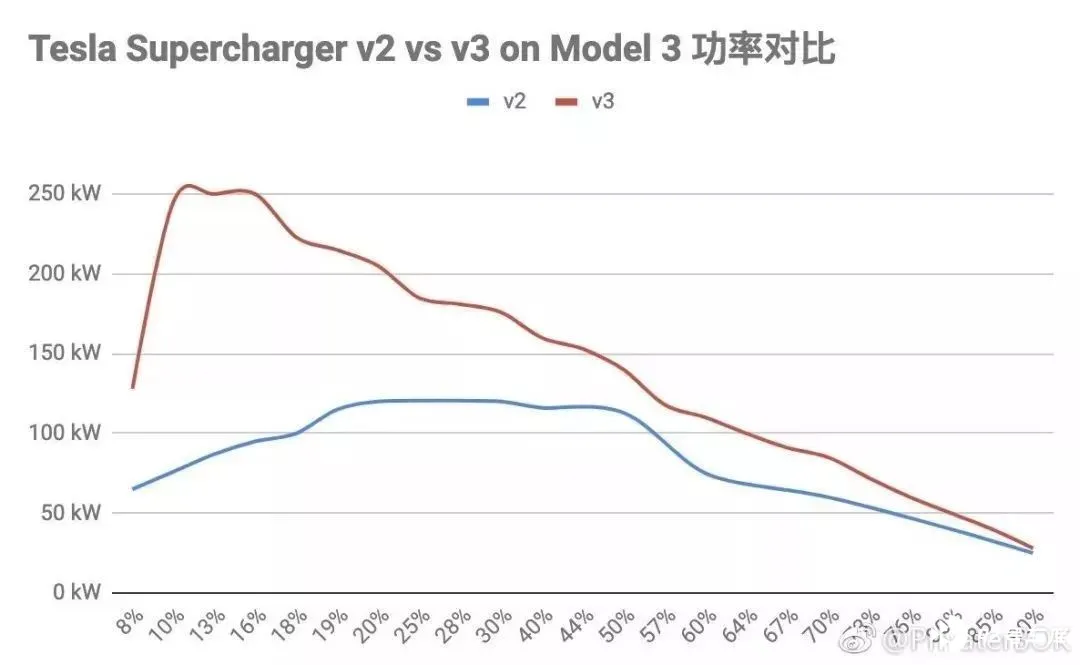 先简单说一下特斯拉 V3 超充,今年 3 月,特斯拉发布了第三代超级充电桩系统,将从 V2 超充原有的 120 kW 峰值功率直接倍升至 250 kW。