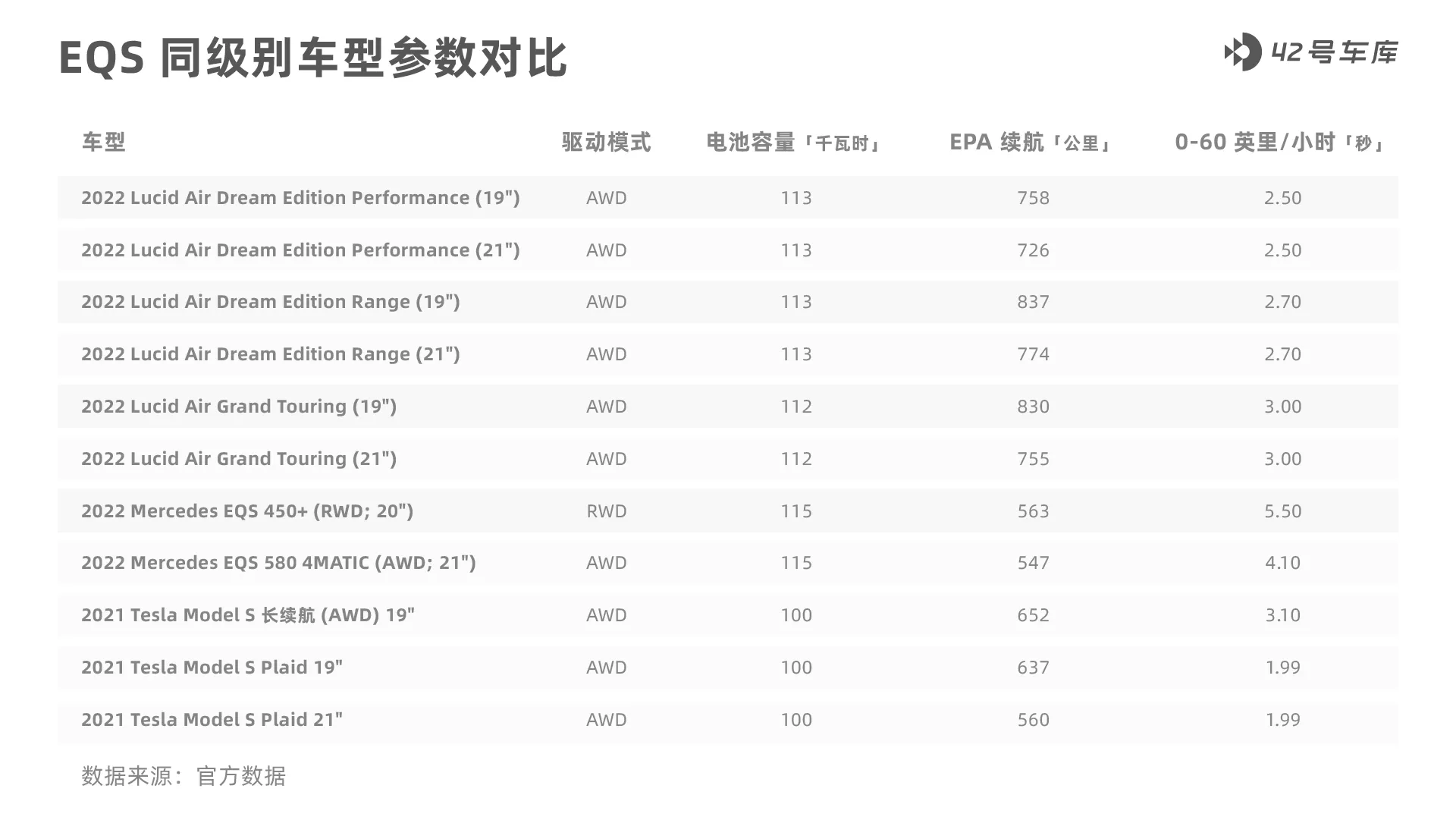 虽然说 550 公里左右的 EPA 续航已经能够满足日常使用,但是鉴于奔驰 EQS 搭载的 107.8 kWh 的大电池以及出色的 0.20 风阻系数,对比特斯拉 Model S 以及 Lucid Air 的续航里程不免让我们有些疑惑。
