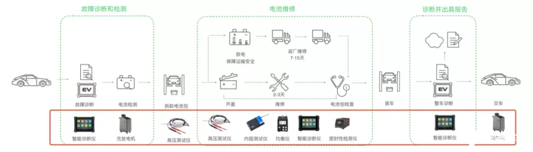 当前动力电池维修整个流程分为 3 个阶段:1、故障诊断和检测,先知道问题出在哪里;2、针对问题进行维修;3、修好后进行复查,出具诊断报告。