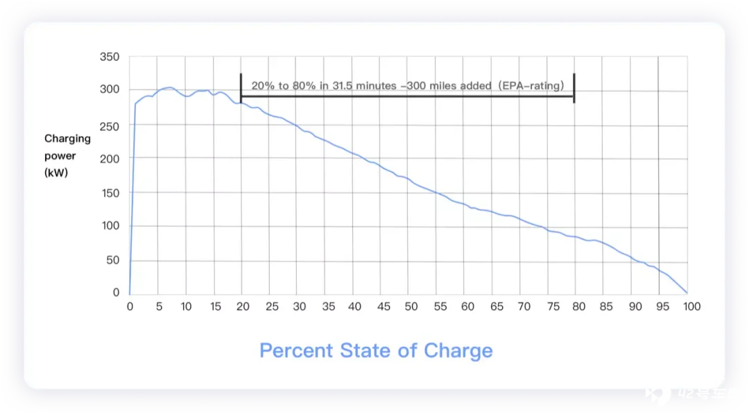 这款 118kWh 的电池最大充电功率,在 1%-20% 的低电量 SOC 下,充电功率可以拉高到 300kW;然后随着 SOC 的增加,到 SOC50% 时,功率大约在 180kW;到 80% SOC 时为 90kW。