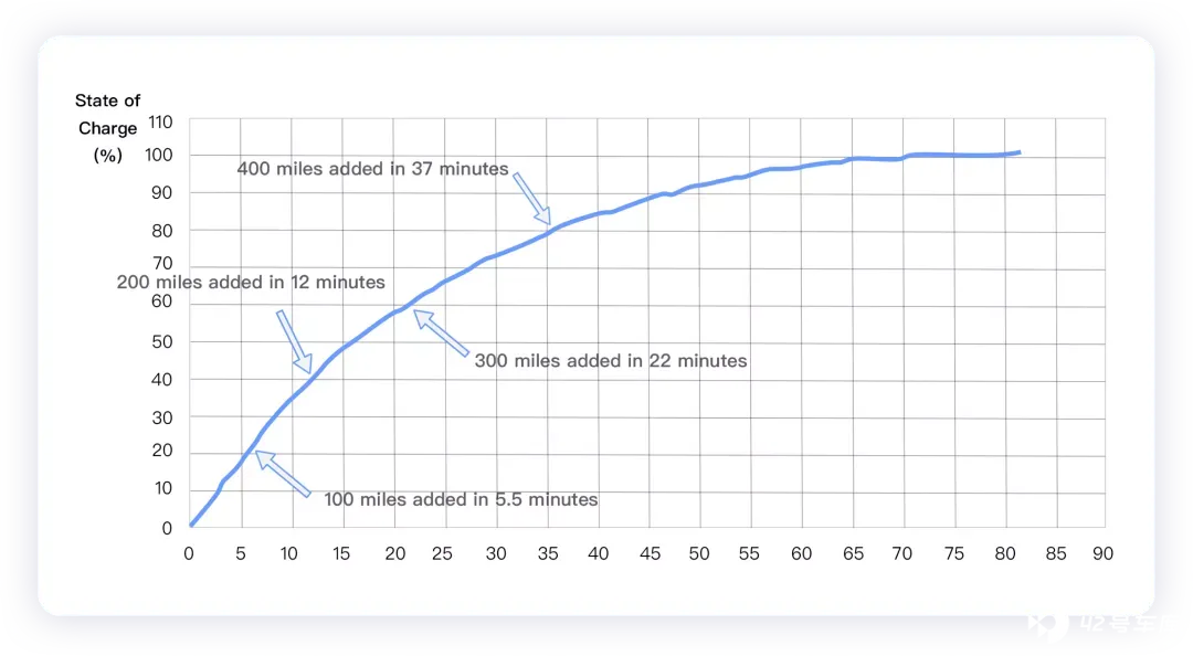 如果按照充电时间来分解,以后这类车估计会形成特殊的使用习惯,因为要充满太久了,第一个 100 英里,只需要 5.5 分钟,第二个 100 英里 6.5 分钟,但是第三个 100 英里就需要 10 分钟,第四个 100 英里需要 15 分钟 —— 这个充电时间增加速度很快。