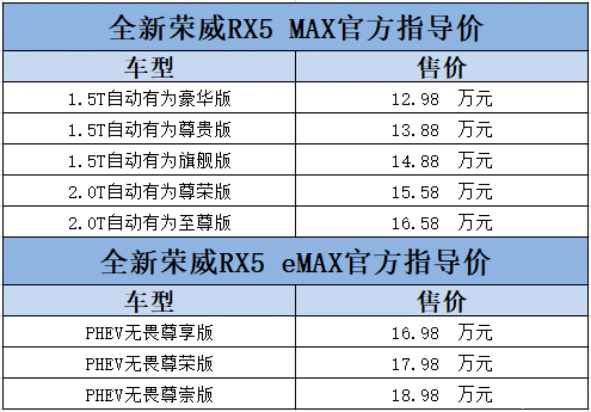 2021 年 12 月 23 日,新款荣威 RX5 MAX & eMAX 正式上市,两款新车共推出 8 款车型,RX5 MAX 售价为 12.98- 16.58 万,RX5 eMAX 售价为 16.98-18.98 万。