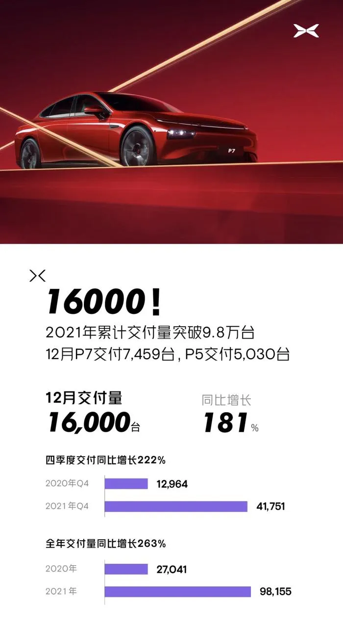 小鹏 2021 年 12 月销量出炉,总交付量 16,000 辆,创历史交付新高,也是新势力三强中交付量最高的品牌。细节交付情况如下: