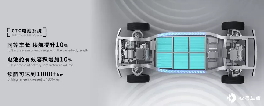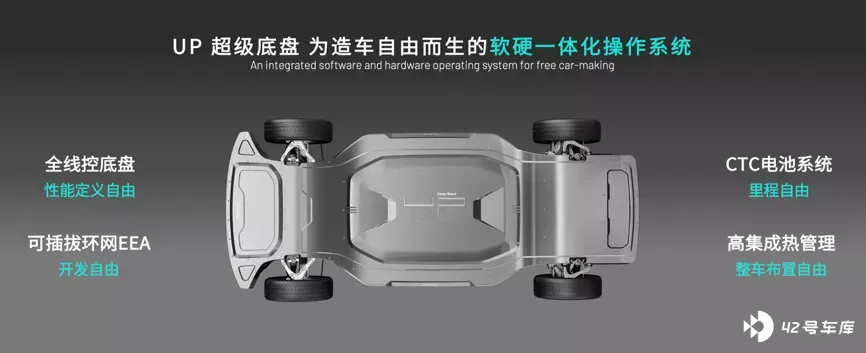 UP 超级底盘采用 CTC(Cell to Chassis)技术,通过直接将电芯集成在底盘框架内部,与底盘一体化设计,实现高度集成化和模块化,增加单位车体电池容量密度,电池舱空间利用率可提升 10%,与同等长度的车型相比,续航也能增加 10%,最长续航可达到 1000 公里。同时,因为取消了电池包的外壳和结构件,整车的重量也可有效降低。