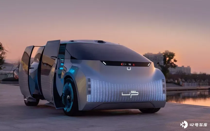 UP SPACE 02 超级 MPV 的定位是一个真正的多元城市移动空间。设计语言上,02 超级 MPV 采用了较为简洁光滑的设计语言,配合上不规则的车窗线条,以及前后保险杠侧面的锐利轮廓,展现出了独特的科技属性,有着很强的未来感。而外扩的前后轮眉,配合 21 寸轮圈,看起来又有着不错的运动感和高级感。并且前后还配有像素灯,可以编程定制灯语,点亮之后可以显示表情,让整辆车看起来更有生命力。