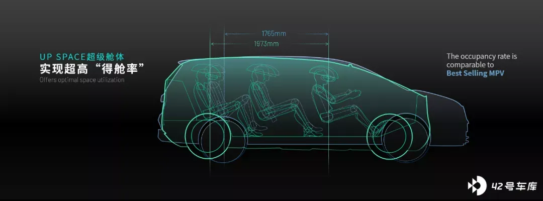 UP SPACE 02 超级 MPV 整车长度与高尔夫相似,但是在内部空间布局上,做到了三排乘员座椅。因为采用滑板底盘,02 超级 MPV 没有传统意义的前舱,再加上无 B 柱的对开门设计,因此可以实现五座、六座、二三排静态对坐等多种座椅组合。