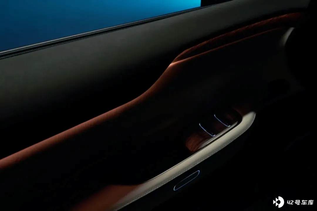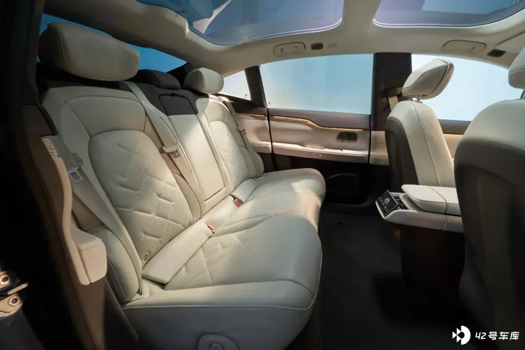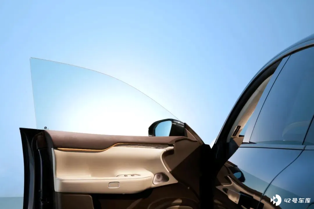 一方面是对自然光的运用。比如,无框门设计,尽可能减少框架感和其他边界的影响,通过纳入更充分和干净纯粹的采光,更好地体现车内空间的宽敞性。再比如,采用双层隔热玻璃的穹顶天窗,面积达 1.9 平米,沐浴阳光的同时,可隔绝 99.9% 紫外线和八成以上热量。