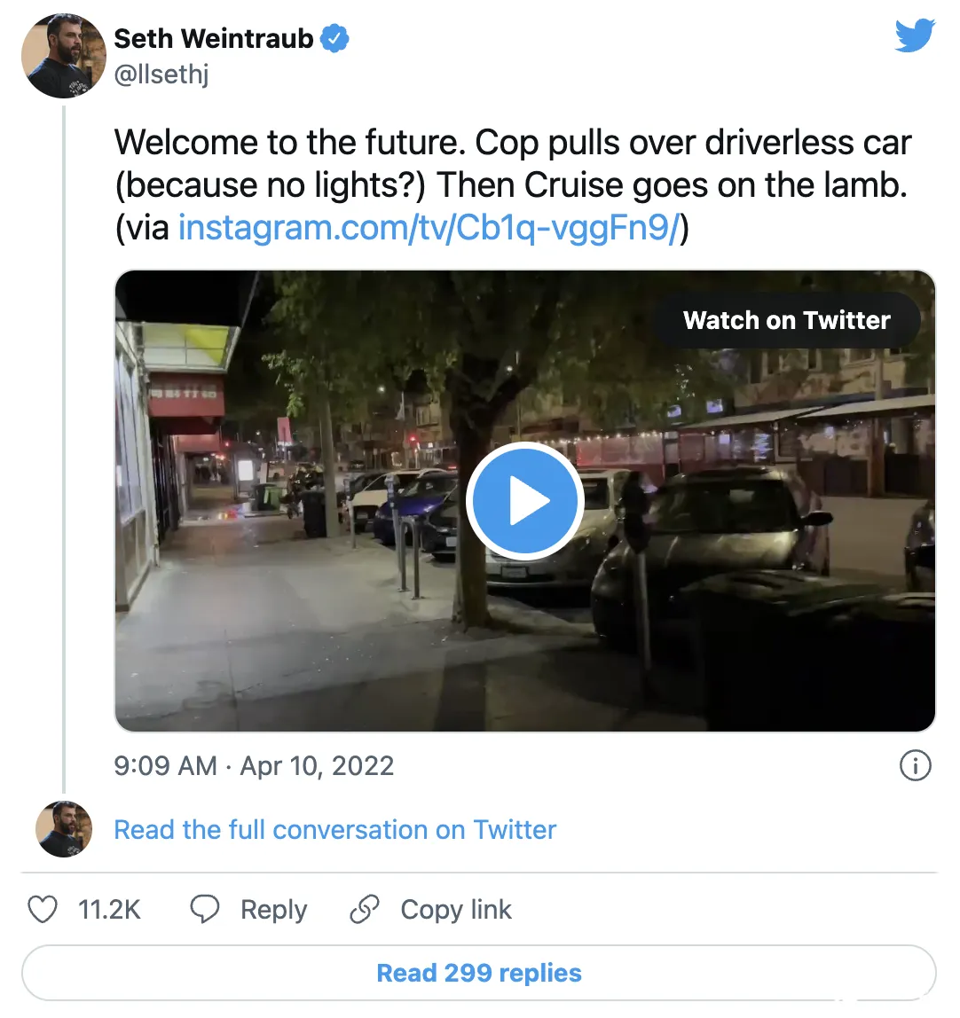 当地时间 2022 年 4 月 10 日,一辆基于通用汽车 BEV 平台的雪佛兰 Bolt 的纯电动无人运营出租车,在旧金山里士满区被警察拦下,但在警察上前查看时「忽然向前加速,驶过一个路口才靠边停下」,事情经过被路人用手机记录下来。