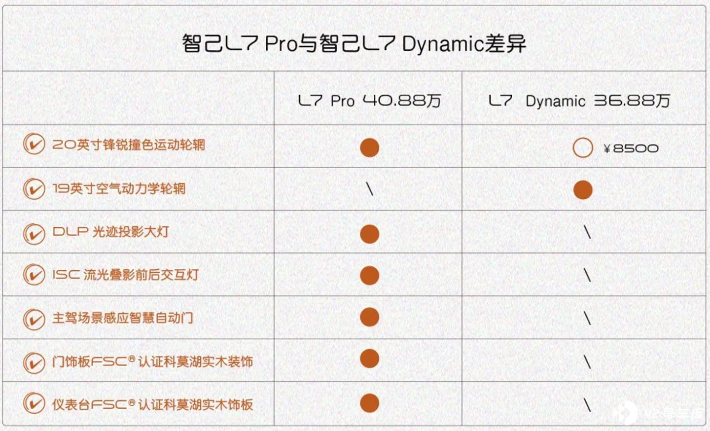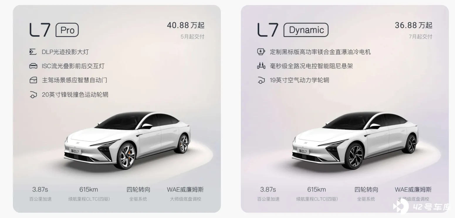 在这次发布会最后,智己上线了 L7 的新款车型:智己 L7Dynamic 版本车型,这个车型主要是在 Pro 车型上删减了一些奢华类配置,比如: