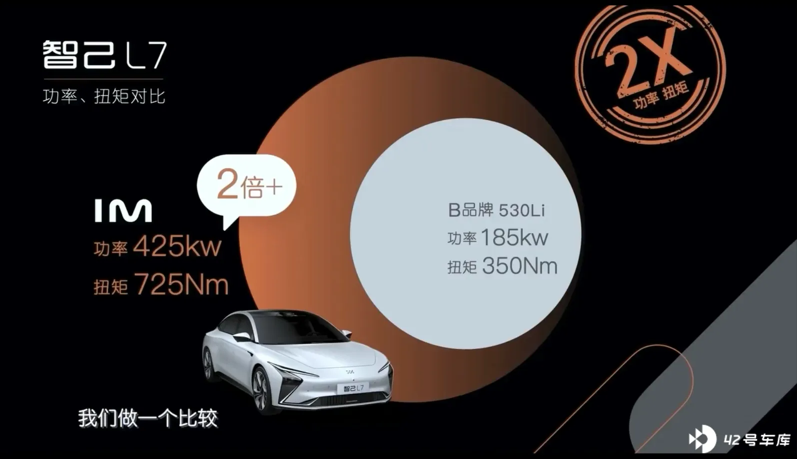 然而,随着新能源化的到来,对传统的汽车认知有了颠覆性的改变,就如同智己刘涛在发布会上说的那样,新能源系统对燃油系统的竞争是一种降维打击,其中主要是因为电动机超高的热效率和瞬间的爆发性能,比如就拿智己 L7 和 B 品牌的车型做对比,下面一张图就很清楚: