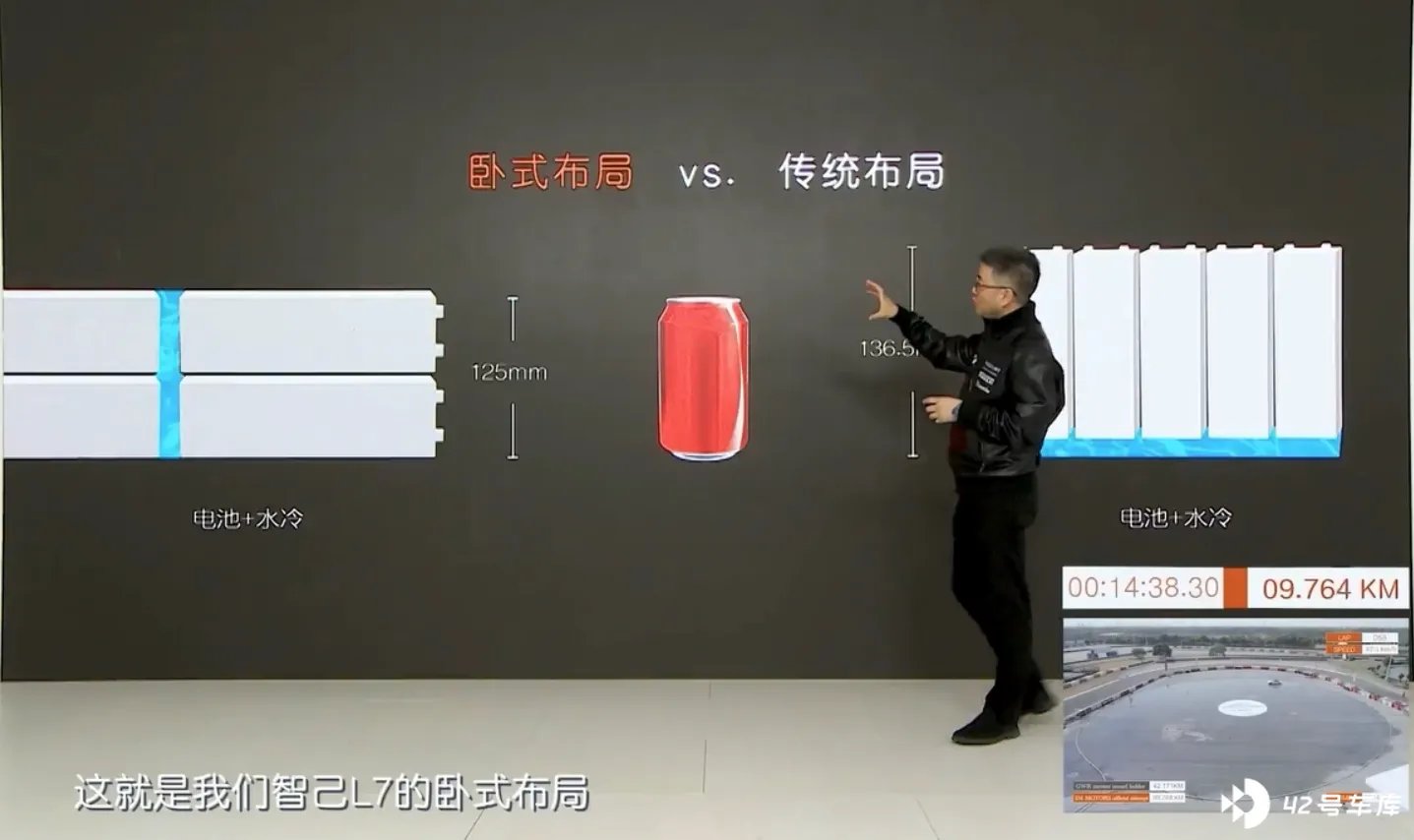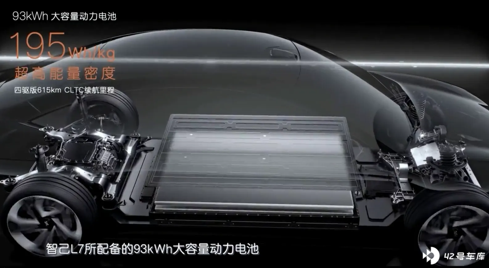 在这里也有一个有意思的小细节,L7 的电池采用了 「躺平」 的结构设计,在这种结构设计下,电池是躺平的结构,从图片中可以看到,电池不仅仅节约了横向的空间,还节约了水冷部分的厚度,厚度达到了 125mm,能量密度达到了 195Wh/kg,为续航提供了强大的保障。