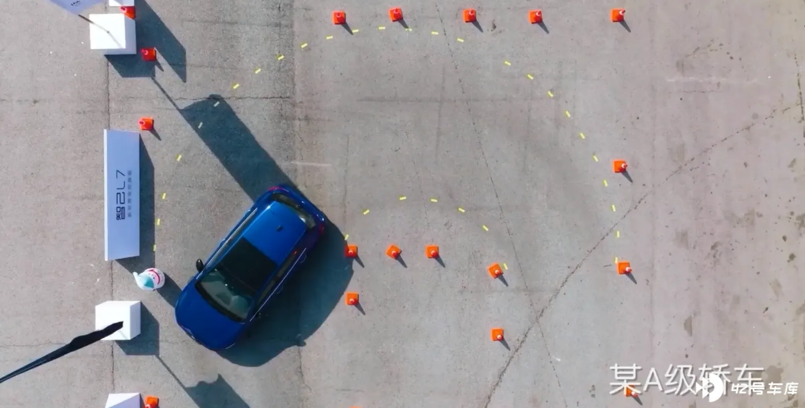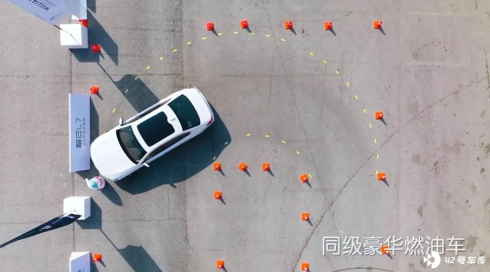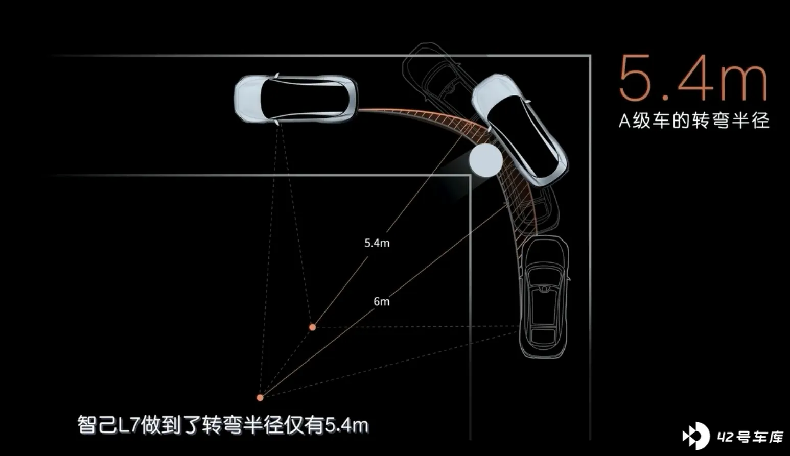 现在,智己 L7 把这个半径做到了 5.4M,这个半径是个什么概念,基本上是可以在双车道道路上一把方向调头的能力了,完全是 A 级车的作派,智己发布会上也提供了一个短片对比,看的就很清楚了。