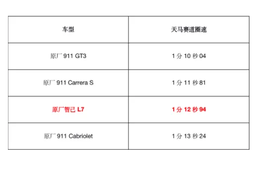 在一张天马上赛道的比赛的成绩单上,我们可以看到,除了特斯拉 model3P 的成绩略微比智己 L7 领先 1 秒之外,其他车辆都在 L7 之后。值得注意的是,智己 L7 是原厂配置,和其他原厂配置的顶级超跑相比,智己的成绩也毫不逊色。