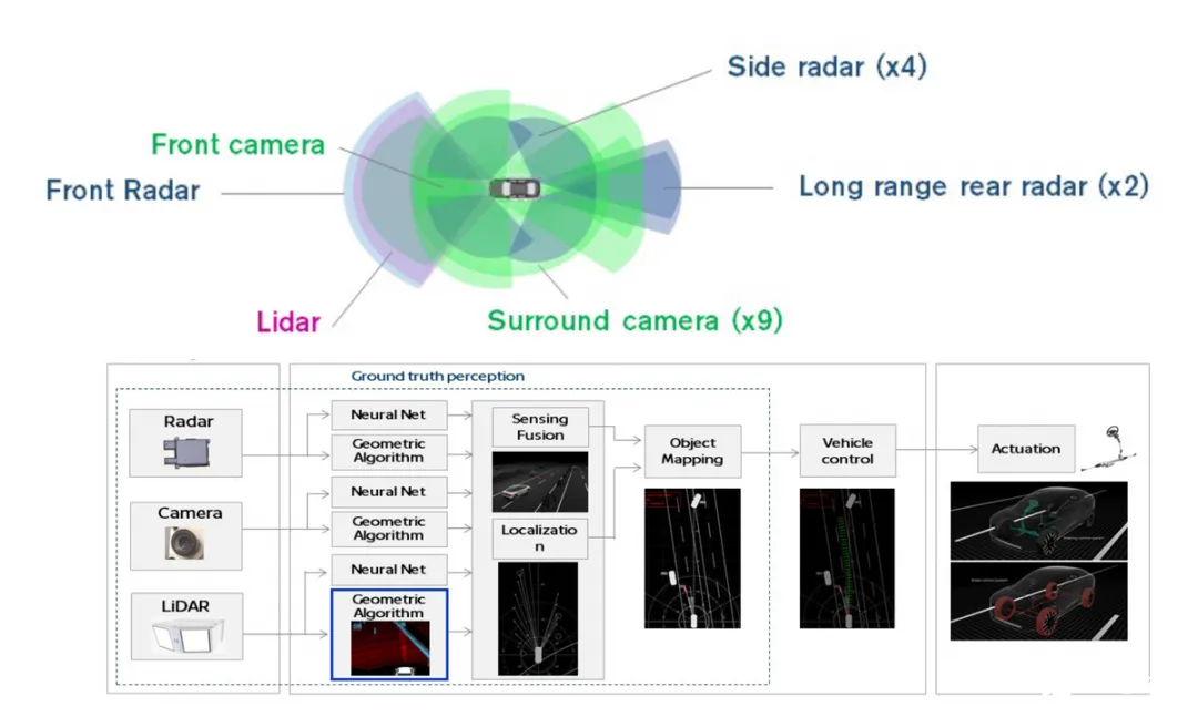 下面这个图可能看得更清楚,日产堆了一圈环视摄像头,在融合算法里面通过雷达、摄像头和激光雷达来做融合,并且称之为 “地面实况感知”。目前日产还没有说整个处理器如何实现处理,这方面将来是否能导入高通 Snapdragon Ride 还是有可能的。
