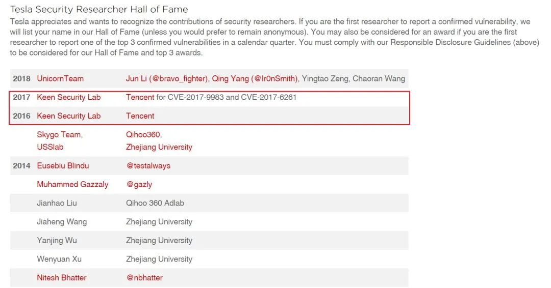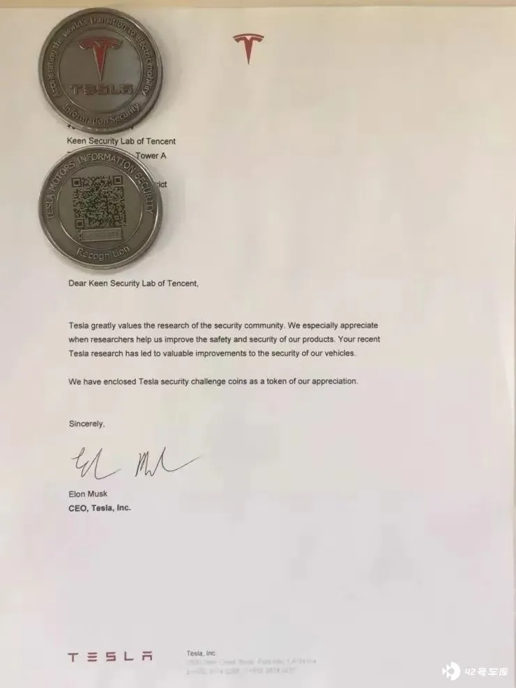 事实上,在科恩实验室提交安全漏洞后,特斯拉给予了科恩实验室 4 万美金的奖励,并将科恩实验室列入了特斯拉安全研究员名人堂。Elon Musk 本人发亲笔信致谢科恩实验室。
