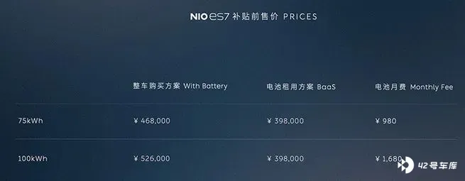 蔚来先创的电池租赁方案依然在 ES7 身上适用,根据官方的购车政策,70kWh 的车型电池包 BaaS 方案起售价 39.8 万元,电池租赁费为 980 元 / 月;100kWh 电池包 BaaS 方案补贴前售价 39.8 万元,电池租赁费为 1680 元 / 月;首发版 BaaS 方案起售价 42 万元,电池租赁费为 1680 元 / 月。