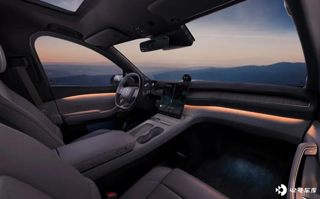 走进车内,ES7 的风格大体与 ET7 相同,但由于轿车和 SUV 的差异,官方称也针对 ES7 做了专门的调整,最主要的就是加强了层次感的营造。比如上半部分(仪表盘、方向盘、中控屏)主要是功能性的操作,下半部分如氛围灯、不同材质的拼接则是为了氛围感的提升。
