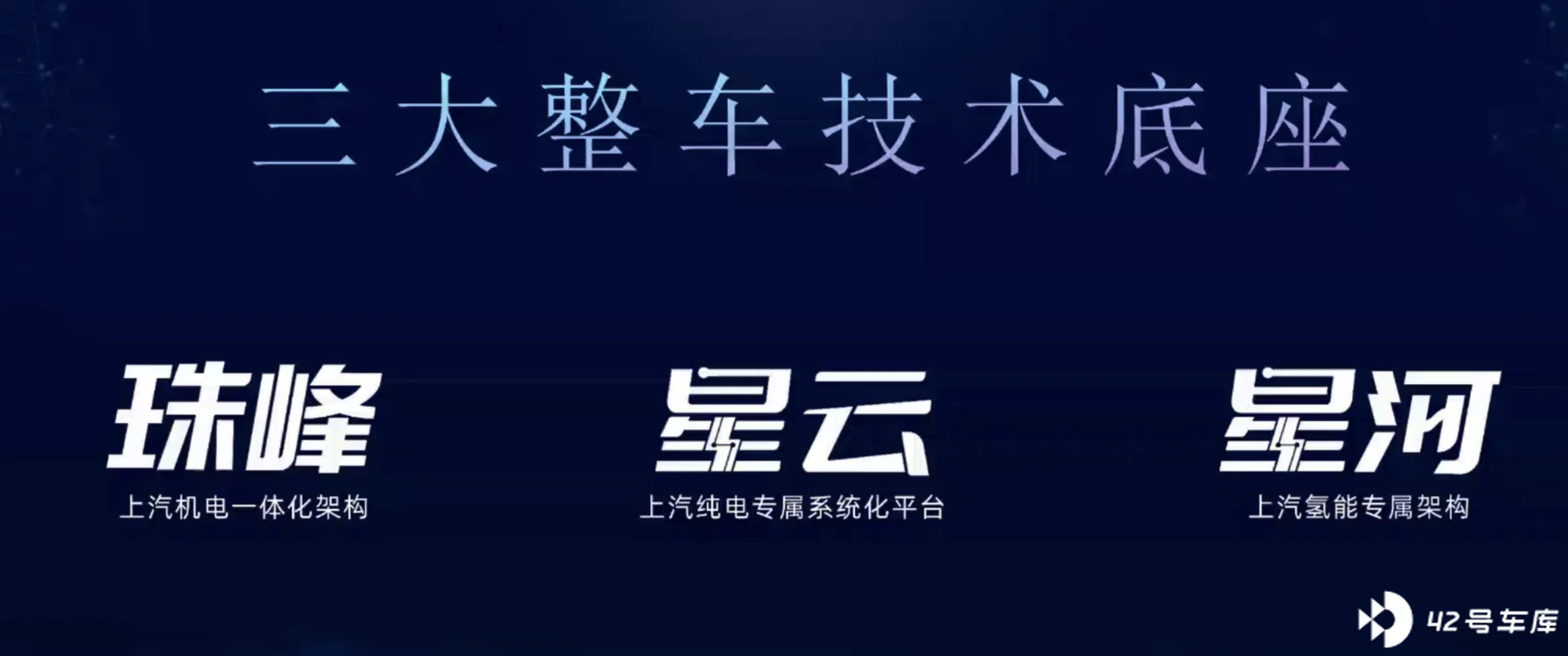「星云」是上汽纯电专属系统化平台,属于三大整车技术底座,另外两个「珠峰」指的是上汽机电一体化架构,「星河」指的是上汽氢能专属架构