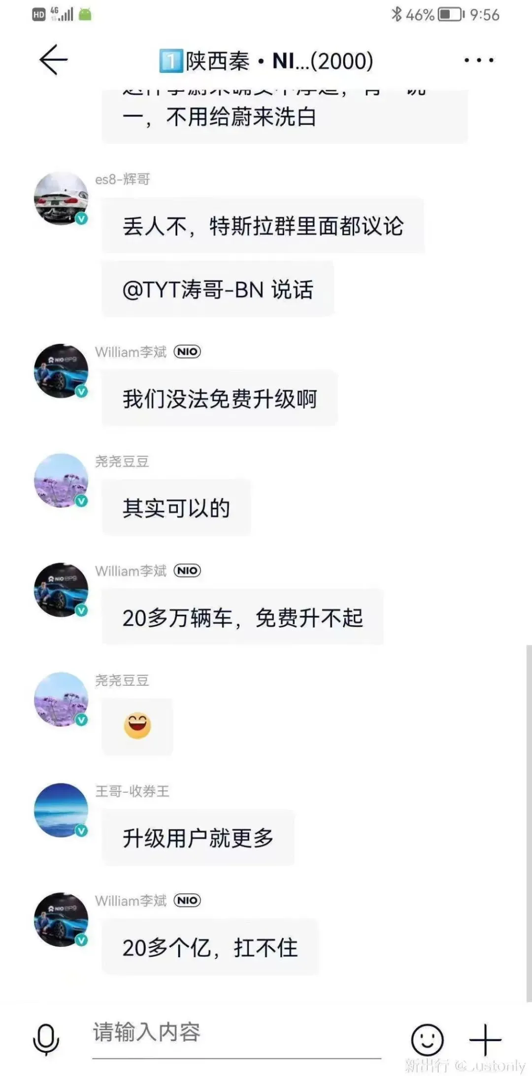 压力立即给到了竞争对手。当晚蔚来创始人李斌在群聊表示:「没法免费升级,20 多个亿扛不住。」