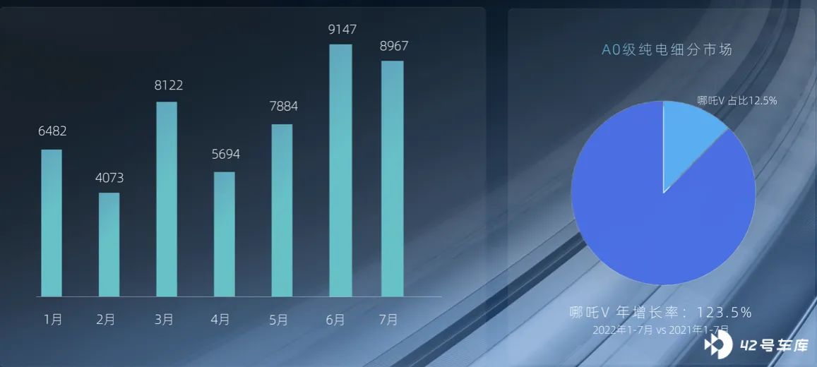 哪吒 V 在今年的 1—7 月销量,占据 A0 纯电市场的 12.5% 份额,这个数字还是很可观的。