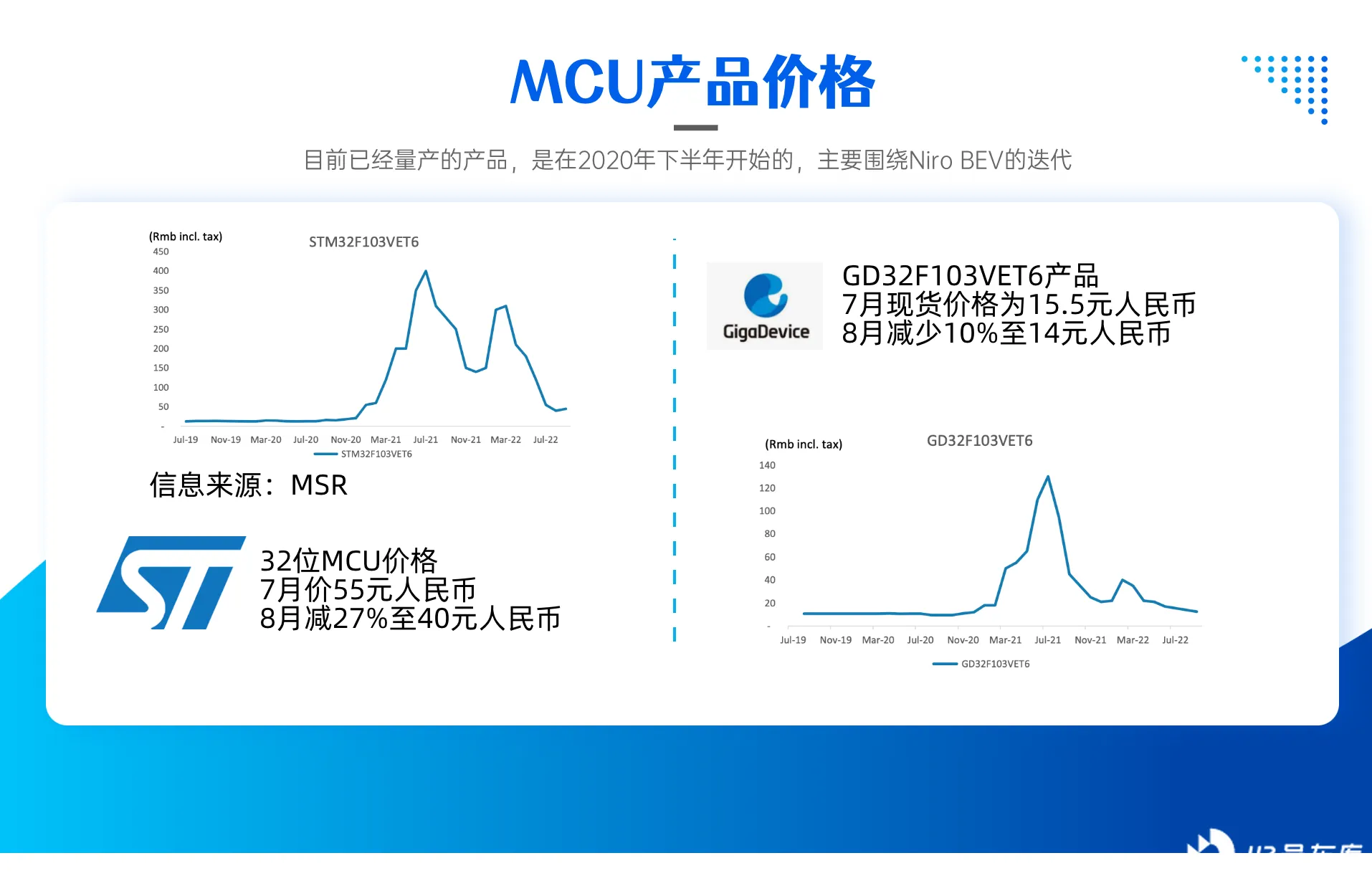 中国 MCU 渠道价格数据于 9 月,意法半导体的 32 位 MCU 价格在 8 月份大幅下跌后,环比上涨 13% 至 45 元(8 月份为 40 元),当前现货报价正在走低,至 30-40 元人民币,这意味着 9 月现货价格仍可能下跌。