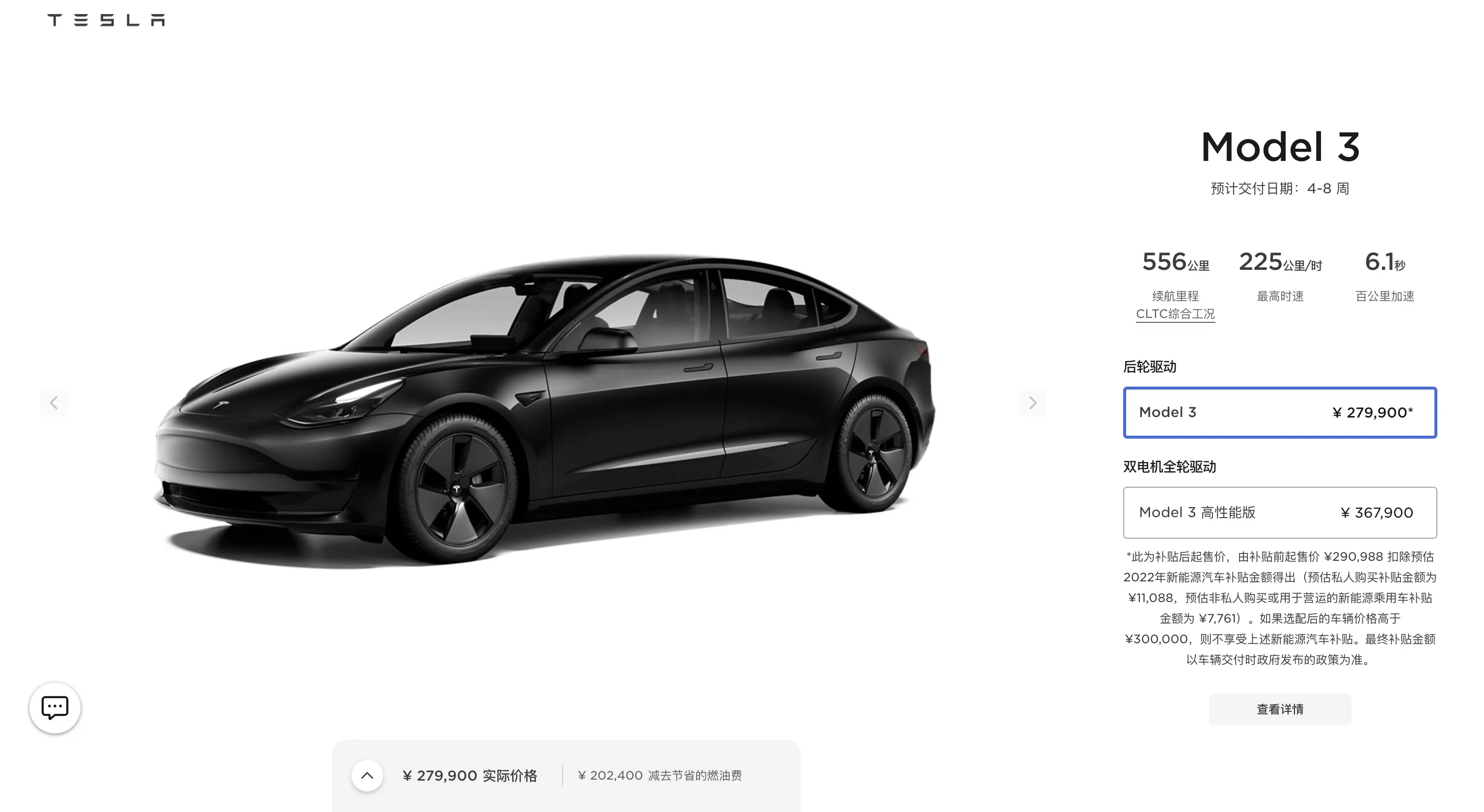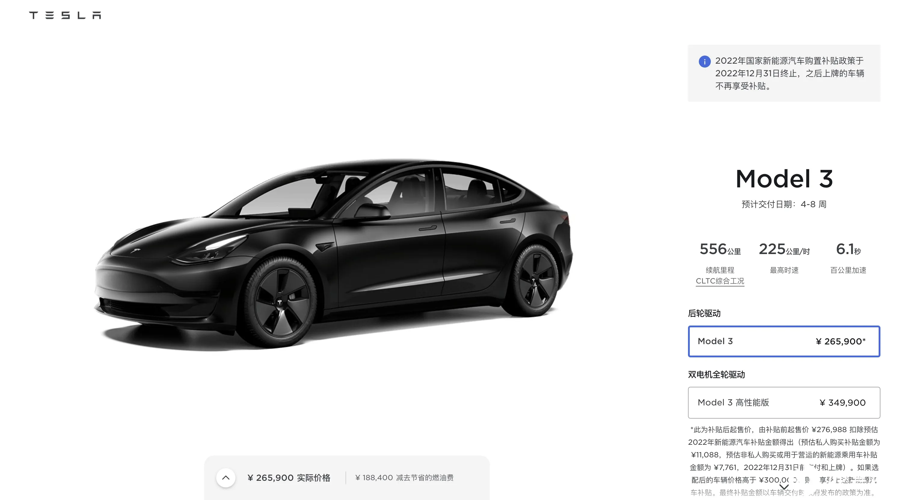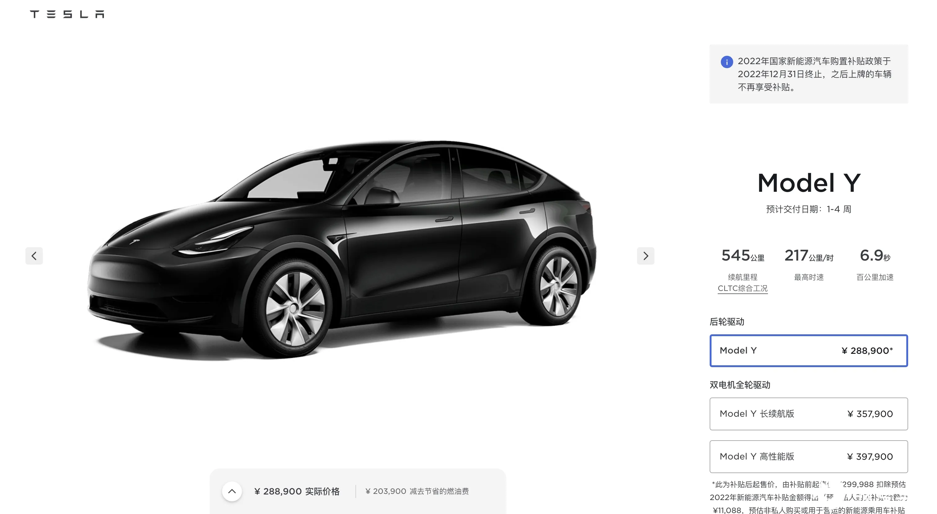 同时,特斯拉还在官网标注了:2022 年国家新能源汽车购置补贴政策于 2022 年 12 月 31 日终止,之后上牌的车辆不再享受补贴。