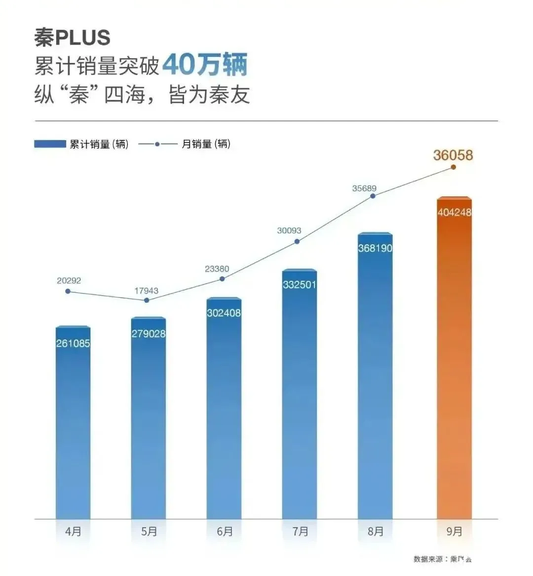 根据官方数据,秦 PLUS 凭借 DM-i 混动与 EV 纯电 「双轮驱动」,在 9 月份单月销量达到 36058 辆,排在后面两位的是 A 级车市场的长期霸主轩逸和朗逸。目前,秦 PLUS 累计销量已突破 40 万辆,距离上市时间,还不到两年。