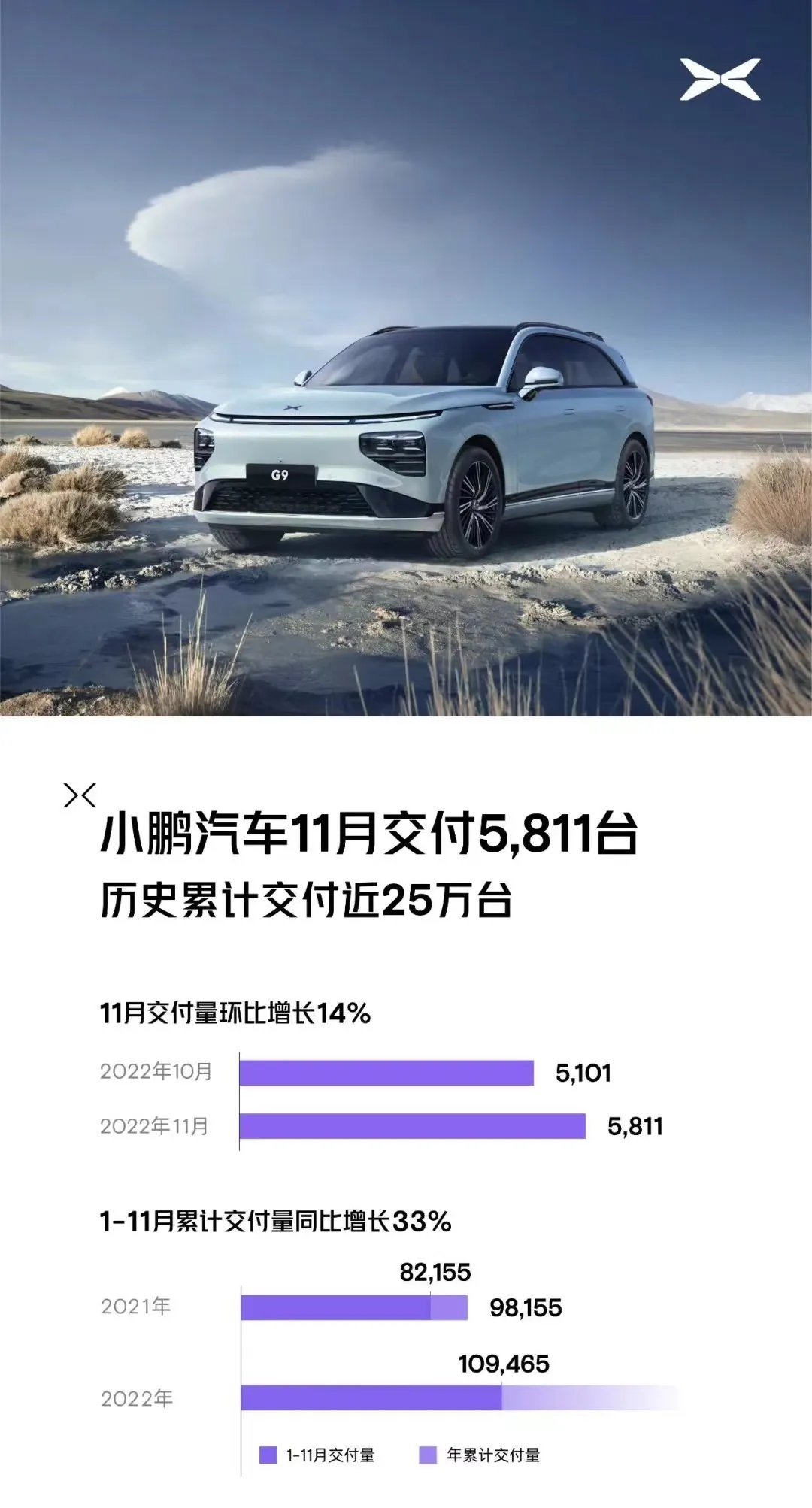 11 月,小鹏汽车总交付 5,811 台,其中小鹏 G9 交付 1,546 台。2022 年 1-11 月,小鹏汽车累计交付 109,465 台,同比增长 33%。