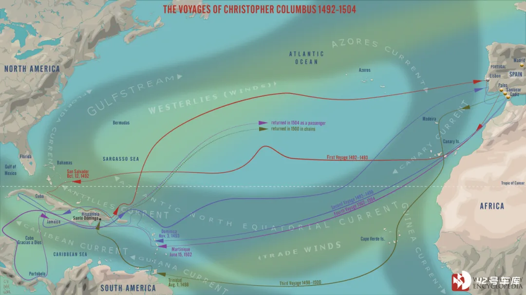 1492 年,哥伦布首次出航美洲,因为与北大西洋暖流相逆,他的团队历经风波,花了近 40 天才完成探险,而 1 年之后,摸清加那利寒流与北赤道暖流规律的他耗时一半,就顺利地完成了同样的行程。