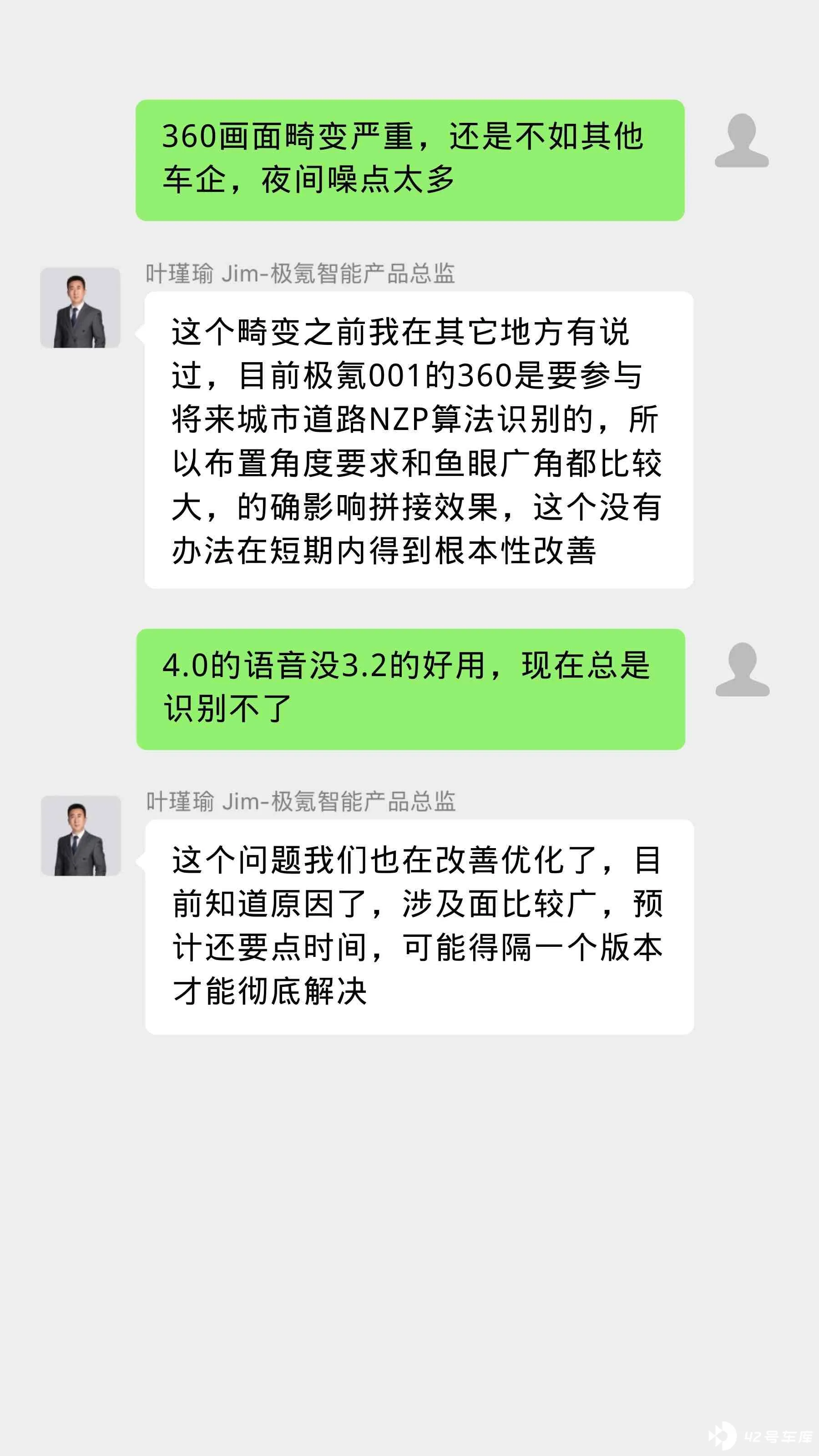 其次声明一点,这个群是42号车库组织的非官方车友群,和极氪官方没有任何关系,而且叶总监也是半夜临时拉进来的,不管是车主还是叶总都没有做任何准备,都是临时提出问题,你一言我一语,你们可以看看这原始聊天记录,如果不加以整理,关键信息是难以提取的。