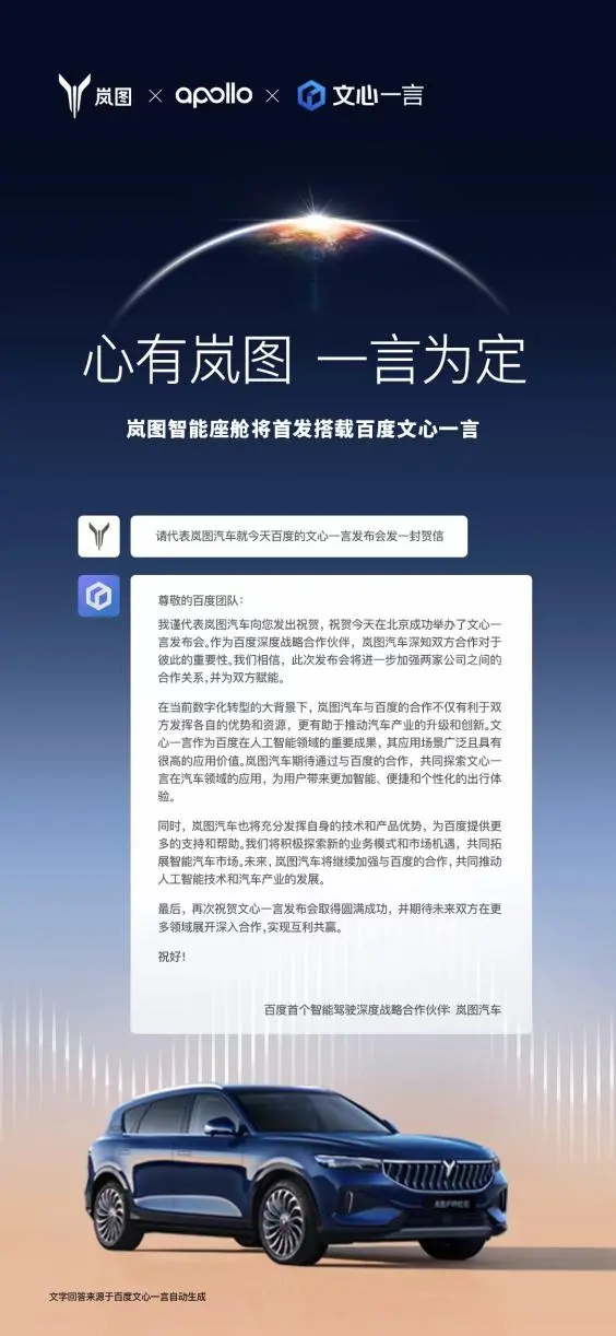 作为首批接入文心一言的车企,岚图将运用 AI 技术,使对话式语言模型技术在国内汽车智能座舱场景中落地。未来,岚图会继续与百度秉持开放合作的态度,优势互补,共享资源,共同投入,打造智能电动汽车产品。