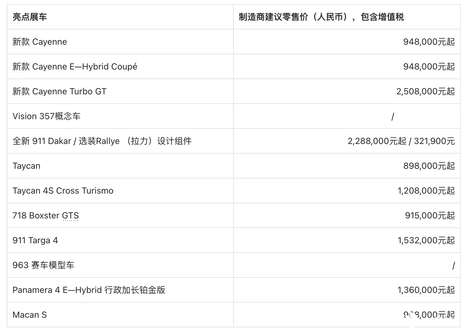 4 月 18 日至 27 日,保时捷携众多新车于第二十届上海国际汽车工业展览会迎来首秀。展台全系共计 13 款车型,中期改款车型新款 Cayenne、Vision 357 概念车、全新 911 Dakar 、Taycan 和 Taycan Cross Turismo 同台亮相。