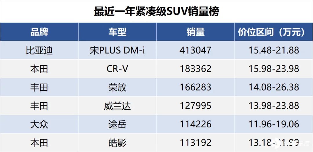 值得一提的是, 宋 PLUS DM-i 一款车的销量,甚至超过了丰田 RAV4 荣放、本田 CR-V 销量的总和。