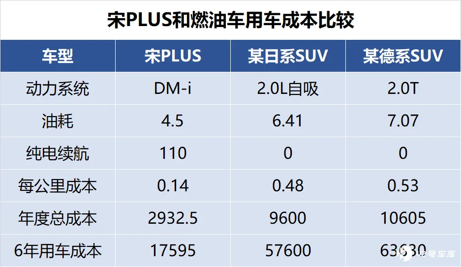 用车主口碑反馈的油耗数据来算一笔账,以 6 年为周期,宋 PLUS DM-i 车主用车总成本是多少呢?