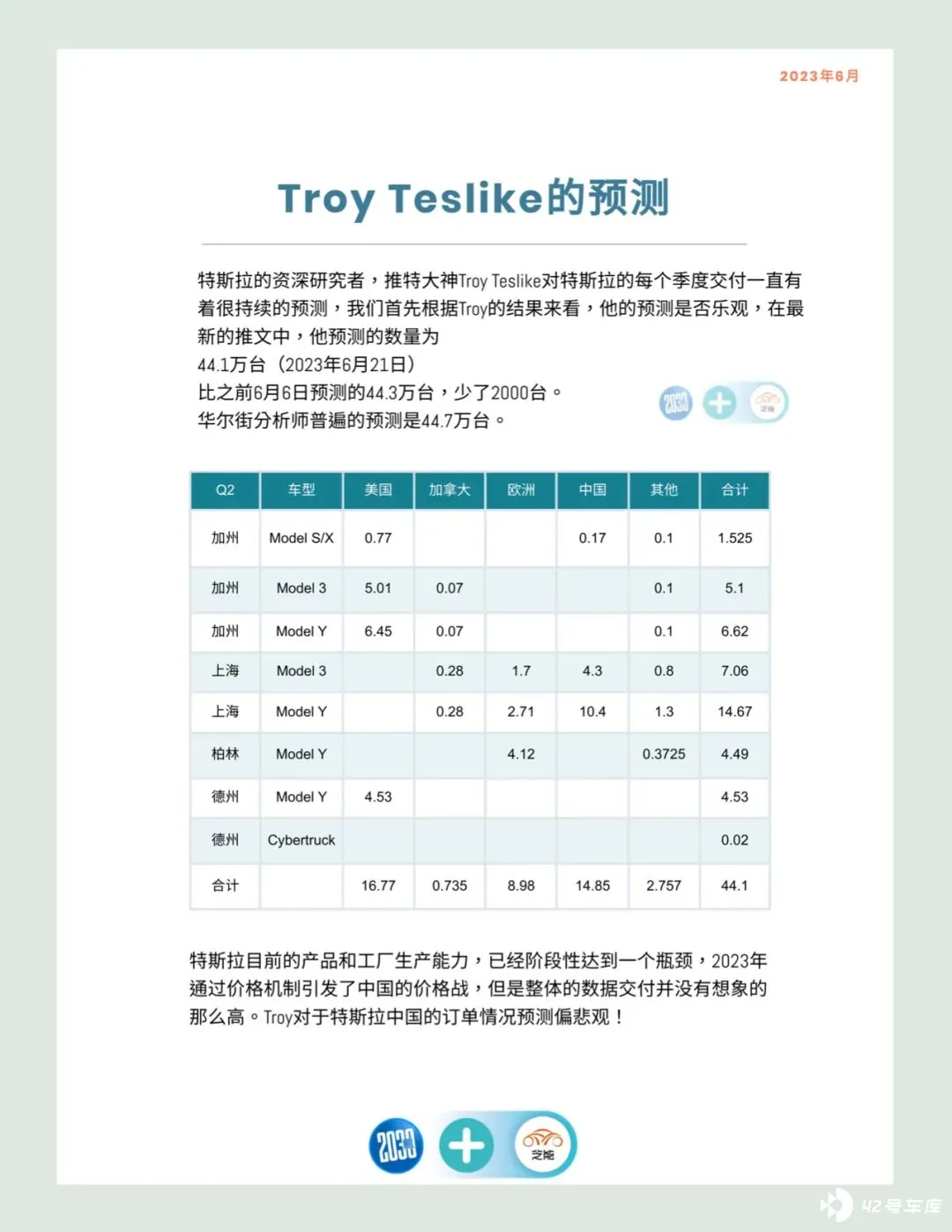 特斯拉资深研究者Troy Teslike一直以来对特斯拉每个季度的交付量进行持续预测。根据他最新的推文预测,2023年第二季度的交付量为44.1万台 (截至2023年6月21日) ,相较于6月6日预测的44.3万台,减少了2000台。而华尔街分析师们的预测则大约为44.7万台。