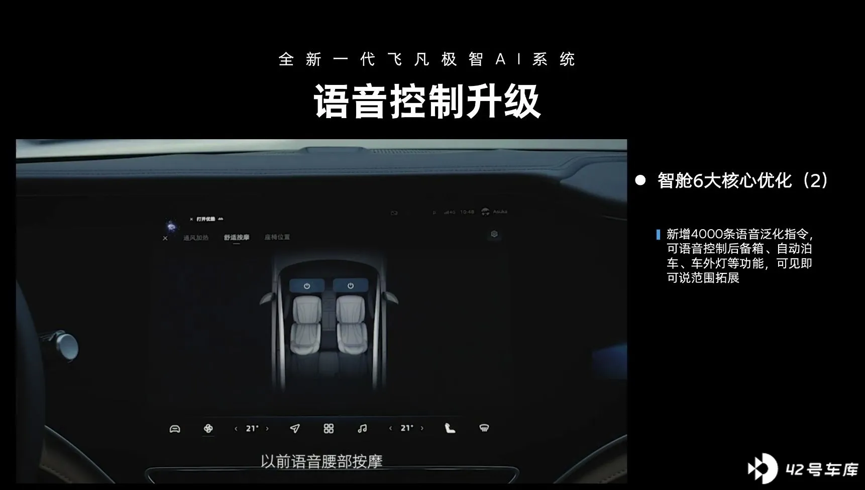 语音控制全面升级,飞凡用户可以享受到新增的 4,000 条语音指令控制,如用语音调节座椅位置,控制驾驶模式,进入自动泊车以及打开和关闭后排爱奇艺 APP 等。