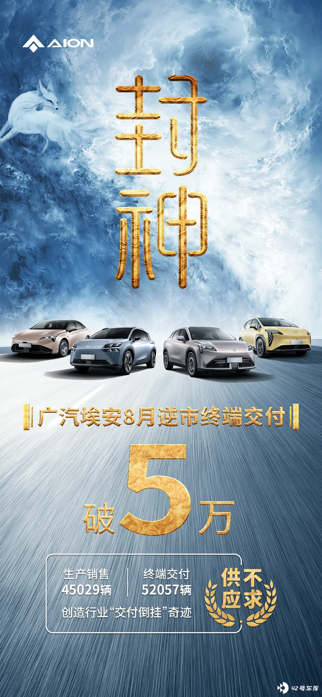 但埃安 8 月产量为 45029 辆,不及 52057 辆的终端交付,出现了行业少见的「交付倒挂」。埃安因此在海报中为自己「封神」,放在传统车企新品牌中,包括新势力及合资品牌,「封神」之说倒也并不为过。