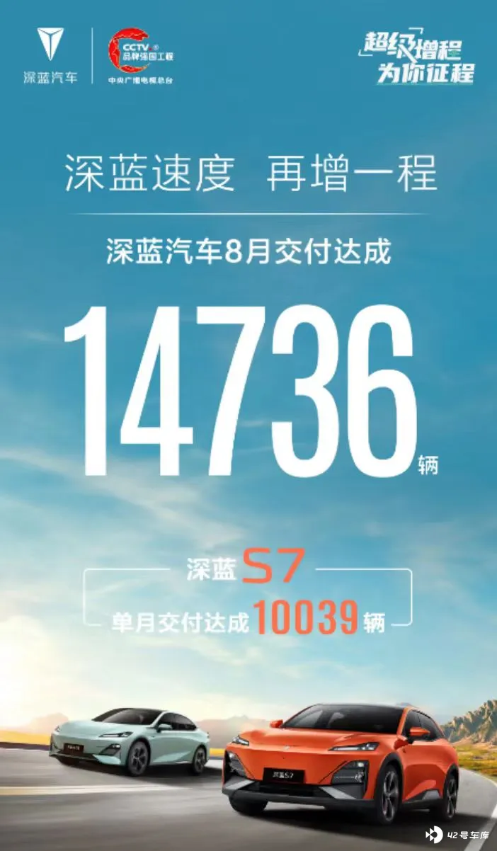 深蓝品牌 2022 年 4 月才发布,首款车型是深蓝 SL03,今年 6 月 25 日又上市了第二款车型深蓝 S7。凭借这两款车型,深蓝汽车今年 7 月、8 月连续两月交付破万,8 月交付达到 14736 辆,环比增长 11.8%。