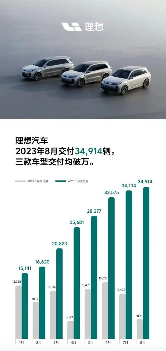 理想 8 月交付 34914 辆,同比增长 664%,环比微增 2.2%。这是因为去年 8 月理想仅交付 4571 辆,才出现了如此巨大的同比增幅。但理想在去年已将月交付量迈上 1 万+,今年则快速稳定地站上 2 万+、3 万+。今年 6 月,理想月交付首次破 3 万辆,8 月已是连续第三个月交付量超 3 万。