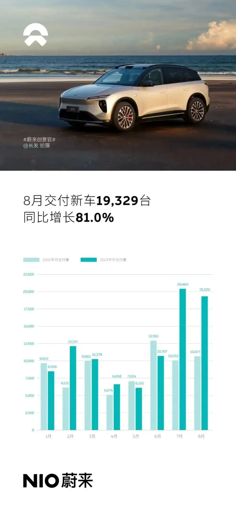排在第二的新势力是蔚来,8 月交付 19329 辆,同比增长 81%,环比微跌 5.5%。蔚来近半年来一直处于舆论的风口浪尖,销量不振、亏损扩大,令外界唱衰声音不少。